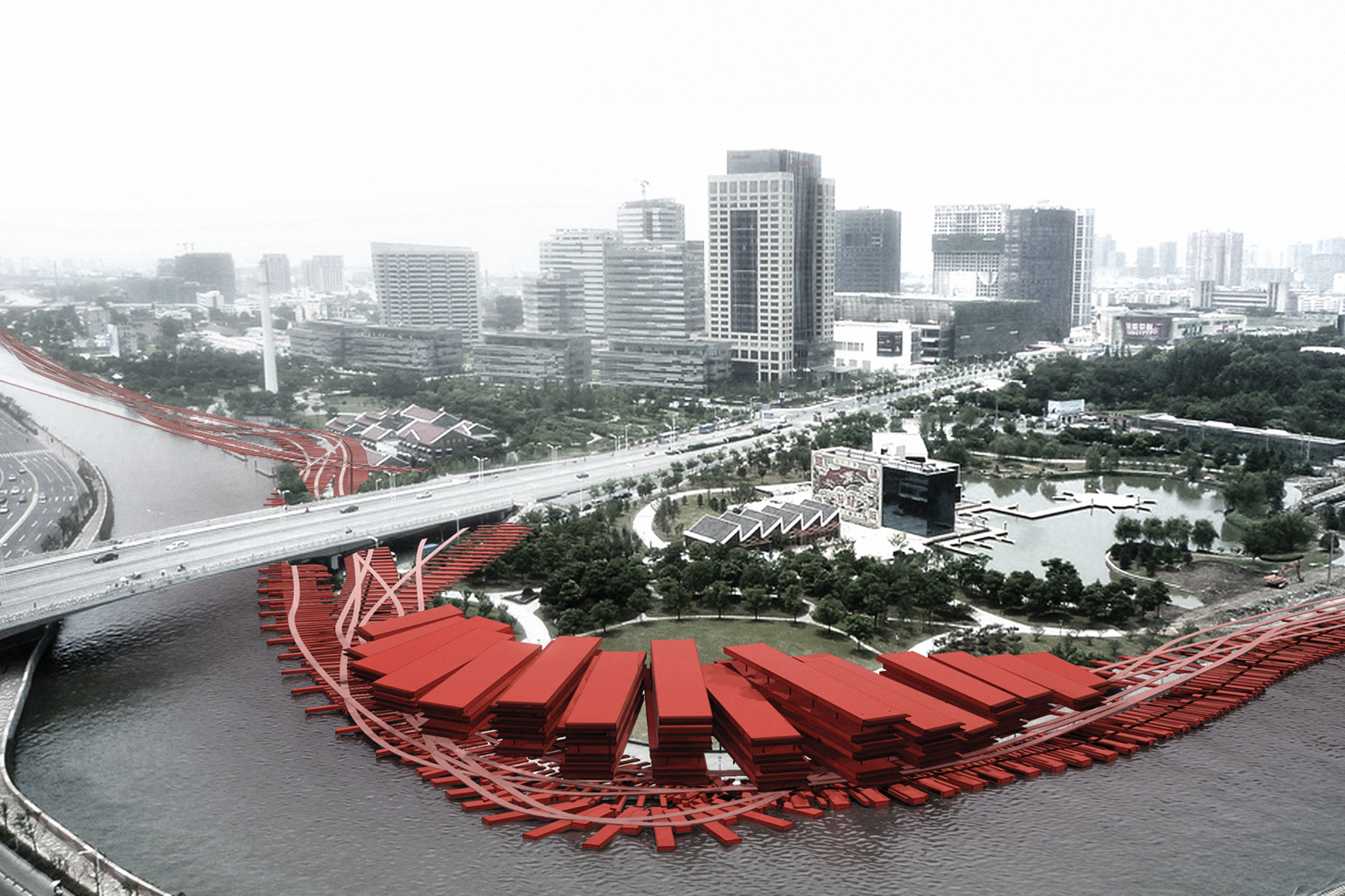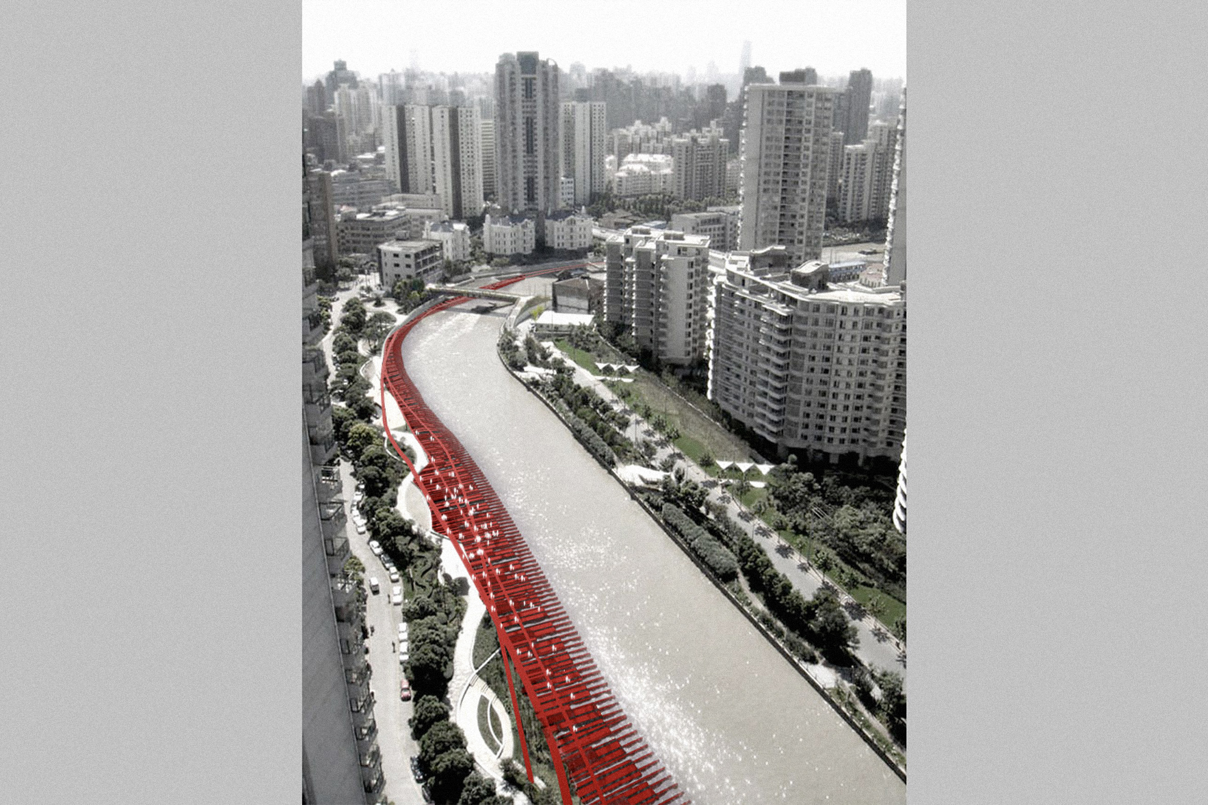 These fillets transform into buildings for all the required uses, commercial, residential, cultural, services and leisure, scattered and repeating along the ribbon taking into account the existing uses near the shores so as to maximize the usage thus increasing the independence of the neighborhoods and minimizing the impact on the traffic. The ribbon path will pass through all the different sectors and uses to further open the river and the new city to its owners / inhabitants, it also creates a promenade that can be used by all ending in the people’s tower, a viewing platform to the new Shanghai center in Pudong and a new symbol at the crossover of the two rivers.