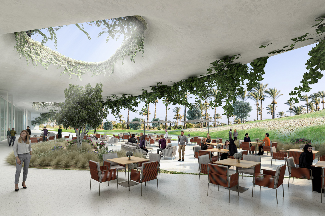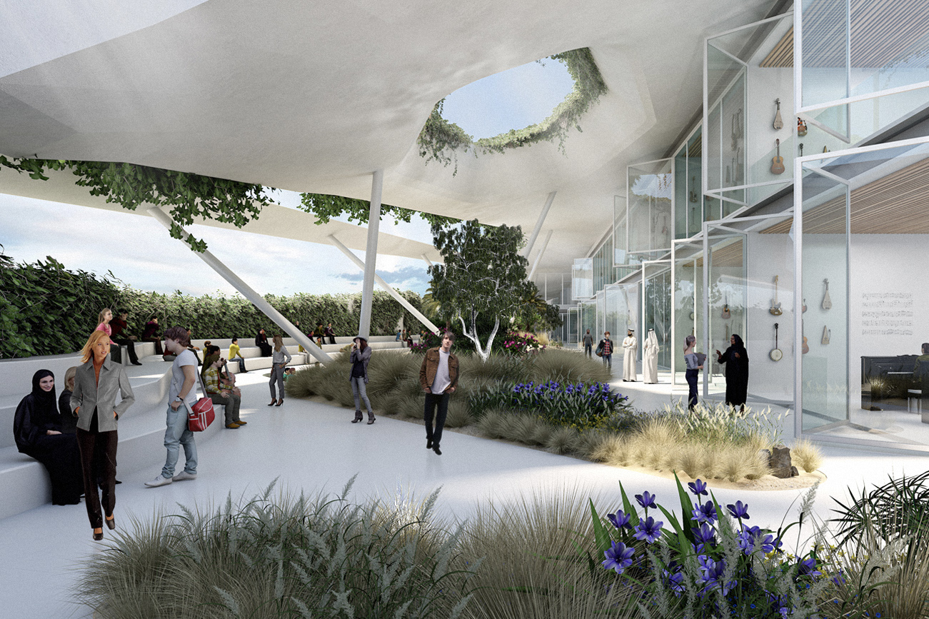 The architecture and interior design are inspired by the wind blowing in the project area. The wind, as an indispensable element for making music, inspires the shapes of the building both in its façade and in its internal communications, creating a sinuosity that allows an organic integration between the building and the user.