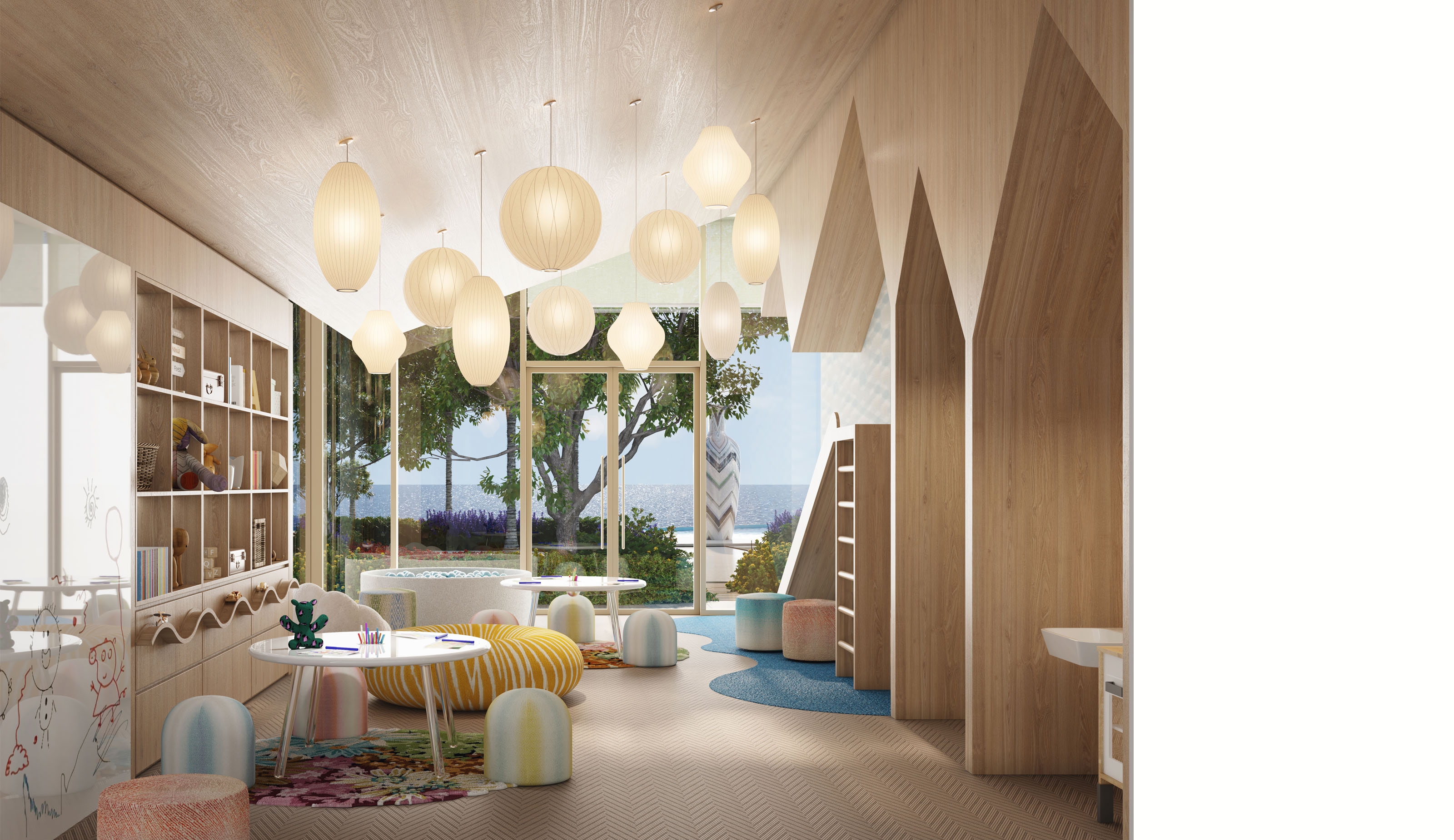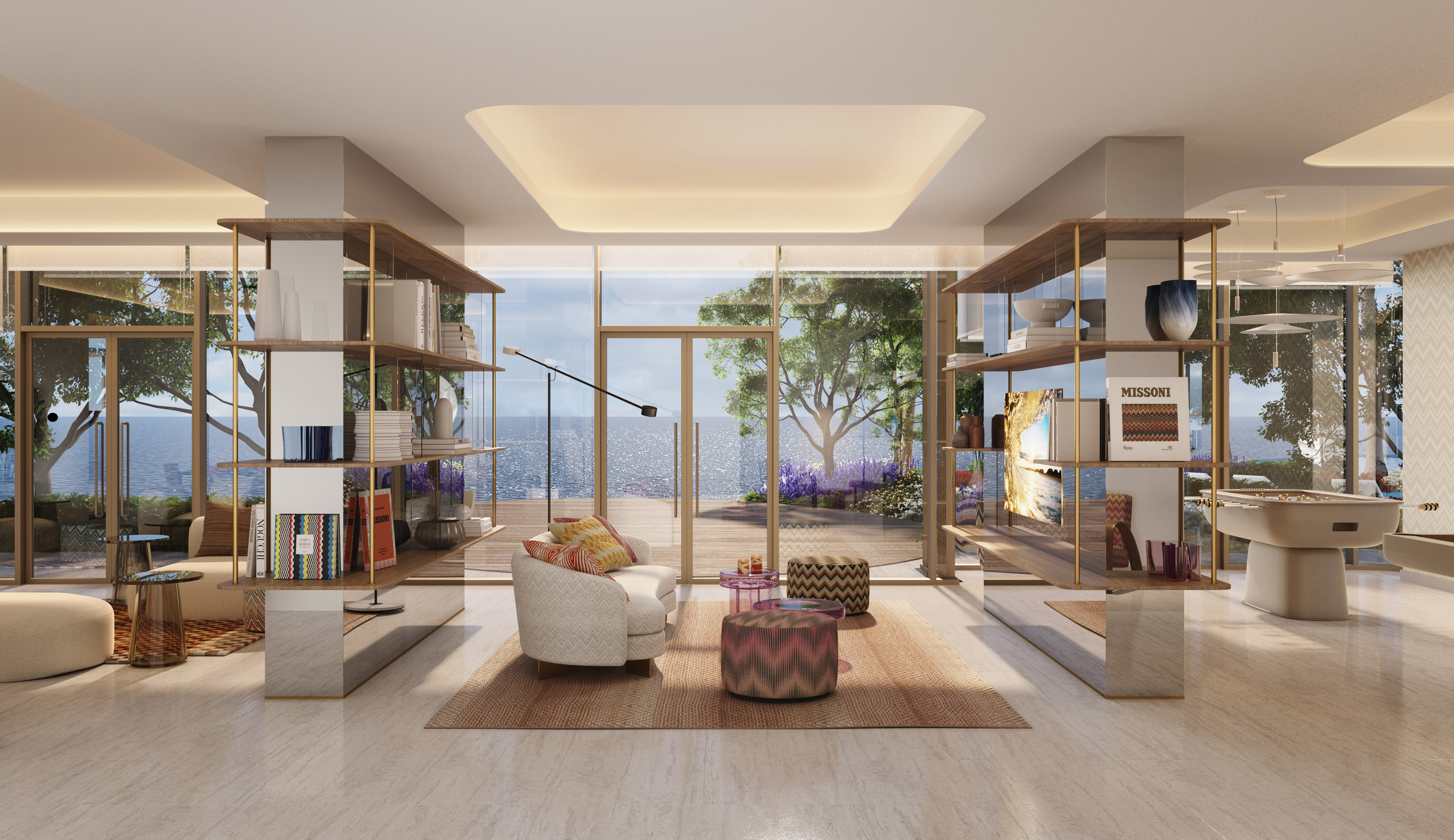 Rich and vibrant fabrics with cheerful geometric patterns add a lively and dynamic touch to the design, contrasting beautifully with the clean lines of the furniture and architectural elements. High-end furniture integrates seamlessly with reflective finishes, bronze details, and soft lighting, enhancing the modern and refined ambiance. From elegant living spaces with floor-to-ceiling windows to serene bedrooms and thoughtfully designed bathrooms, every detail contributes to a cohesive and serene environment that reflects the beauty, vitality, and tranquility of the sea.