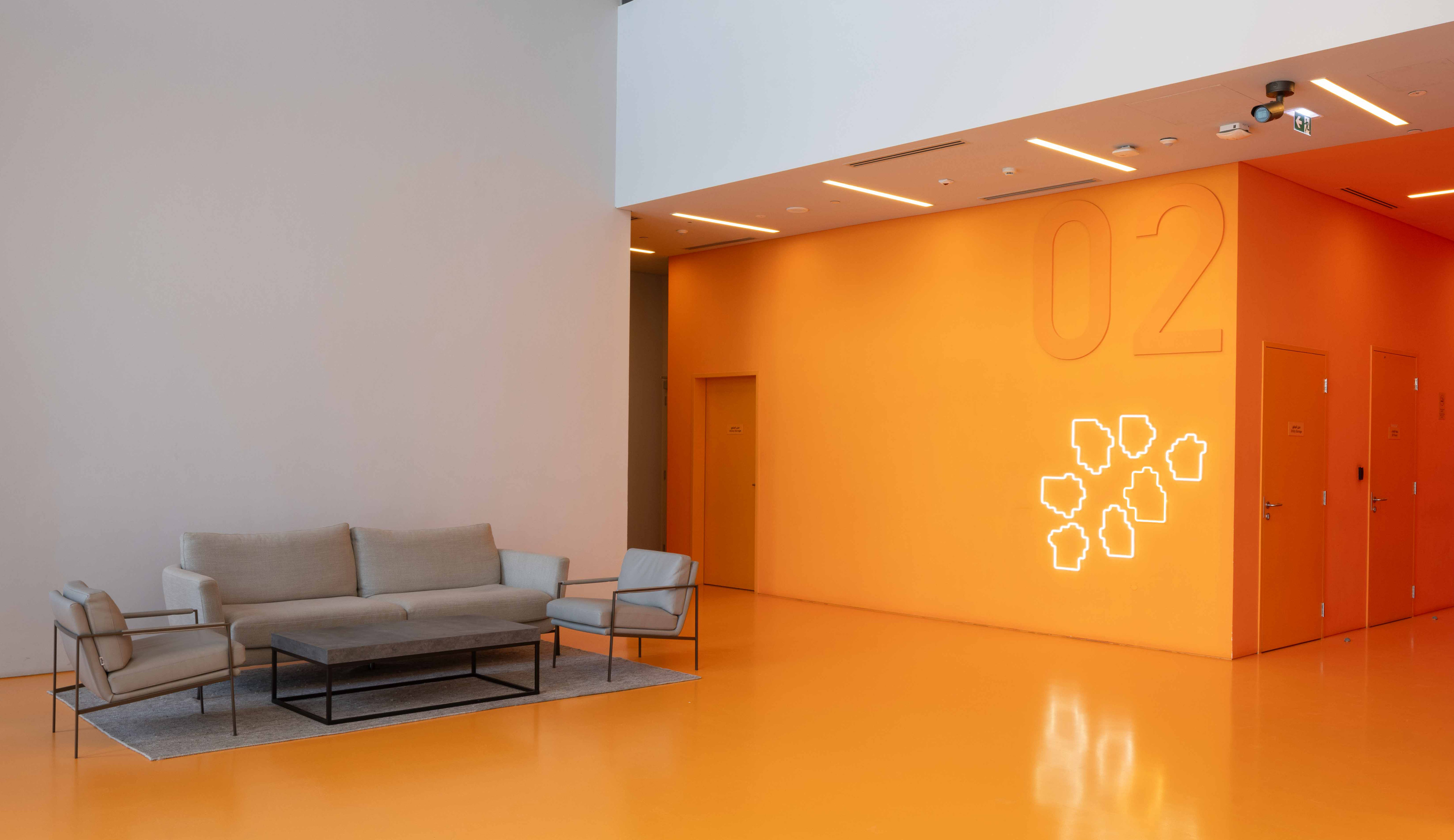 Each tower has been assigned a bright graffiti color: Olive bright green, Orange, Lavender, Jade, Ice Blue, Yellow, Perfect pink. Each color creates a certain atmosphere corresponding to the functions of the public places. For instance, the Makers Early Learning center is located in the Orange tower as orange colors increase creativity, happiness and joyousness whereas the Makers Clinic is situated in the Jade tower because indigo colors stimulate calmness and inner strength. The highlights in the interior design are related to the main components used by artists, such as light, color, shapes and textures.