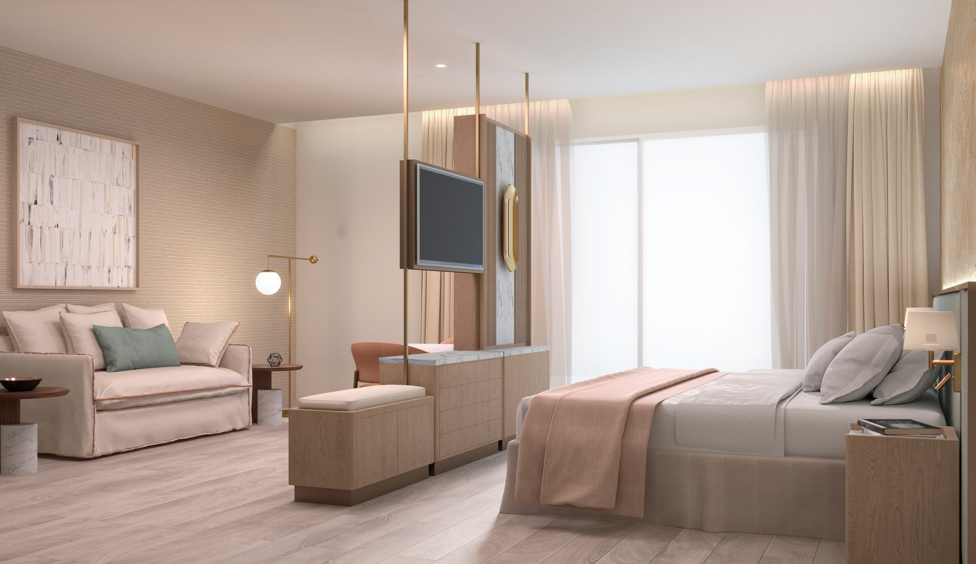 The palette scheme dances with the golden whispers of the central deserts, giving the design a smooth and cozy character. Beige hues, inspired by stone and angular shapes, are complemented by details in oak tones, providing an exclusive atmosphere to the space. Desert Sand, a hue mirroring the sun-kissed dunes, embraces the feeling of warmth