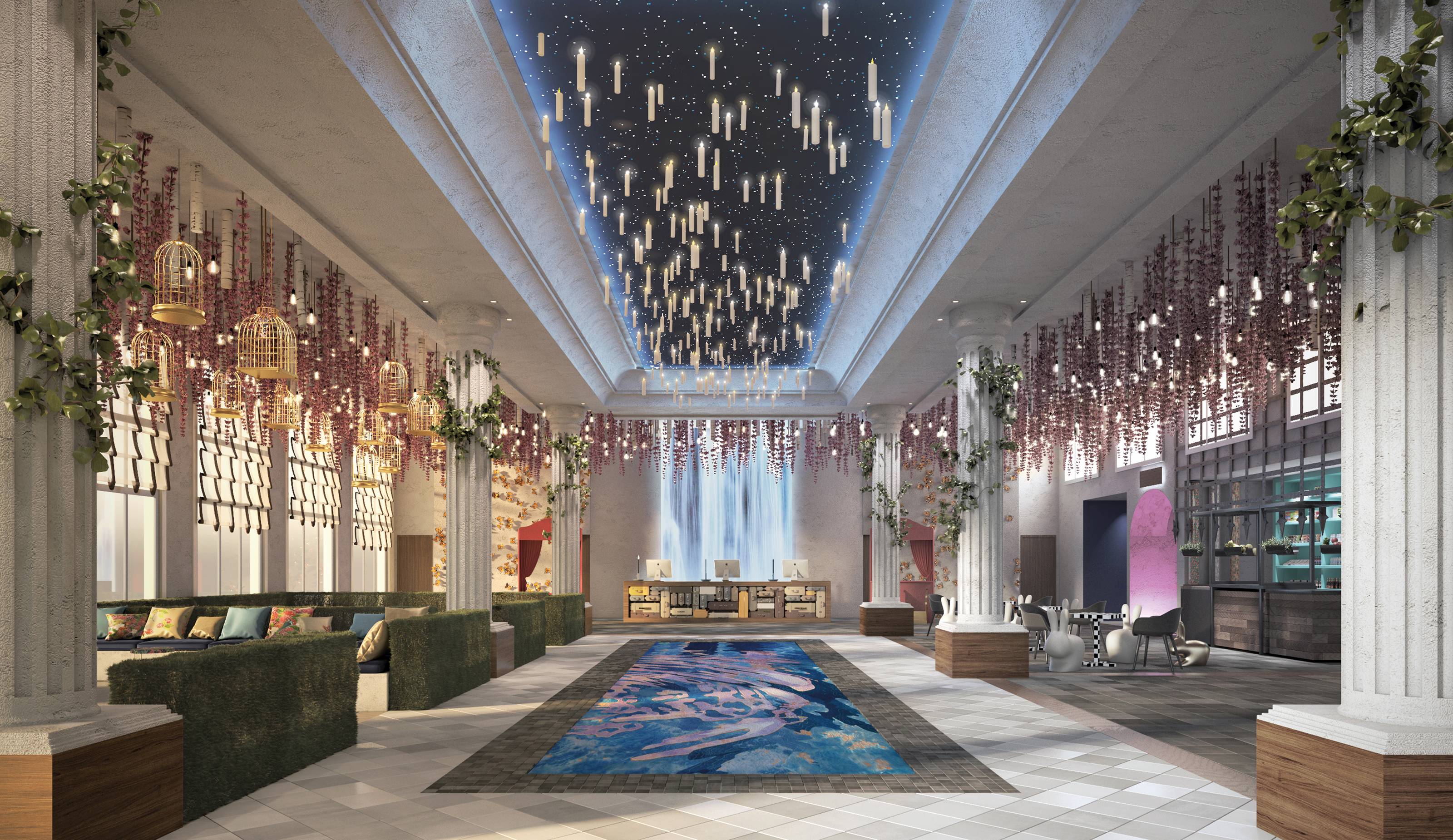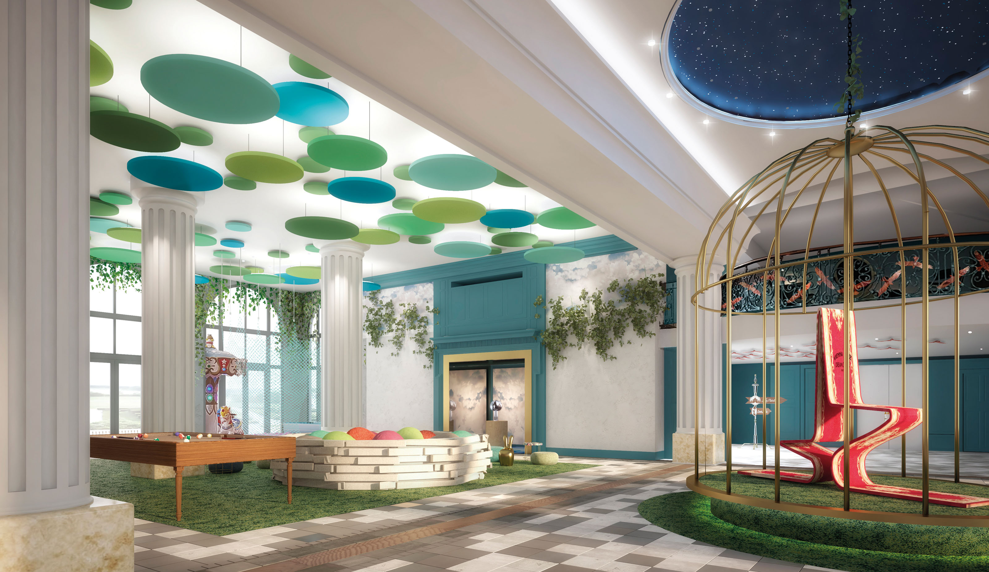 The “dream” features are achieved by several elements. The blue palette in the ceilings filled with candle-like pendant lamps resemble the light of the stars when we contemplate the sky at night, creating a sensation of awe. Hanging cages, lights hiding between nature-like decoration which is also suspended from the ceiling and the hedges which form natural space divisions, highlight the sensation of a magical garden.