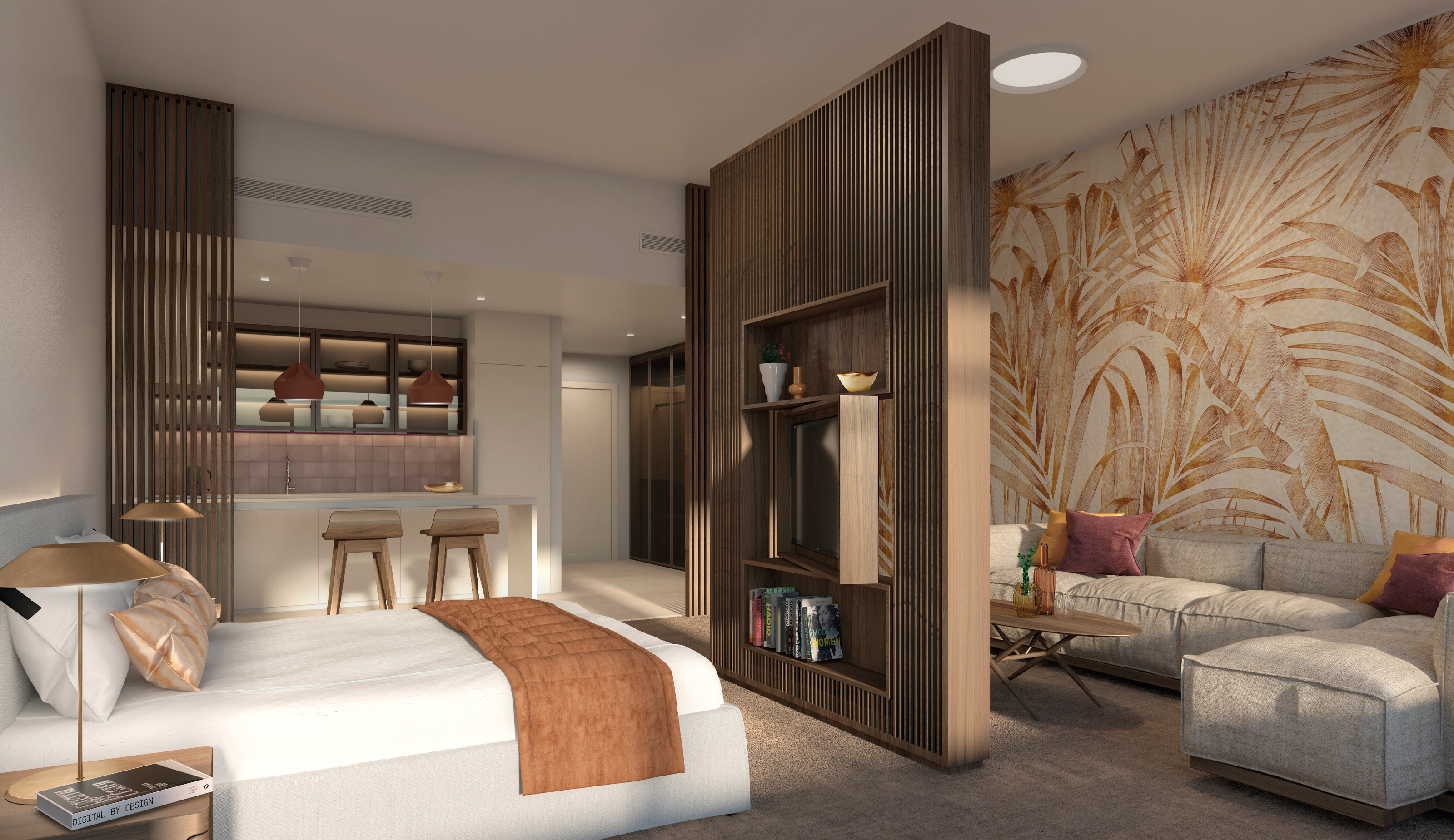The atmosphere of the hotel feels like entering a peaceful oasis. The guests are welcomed with a long central water feature that mimics a mirage in a desert, with the reflection of a chandelier that looks like sand dune contours. Some geometric patterns on furniture, mosaic tiles and carpets make a subtle reference to the local identity and its Nature.