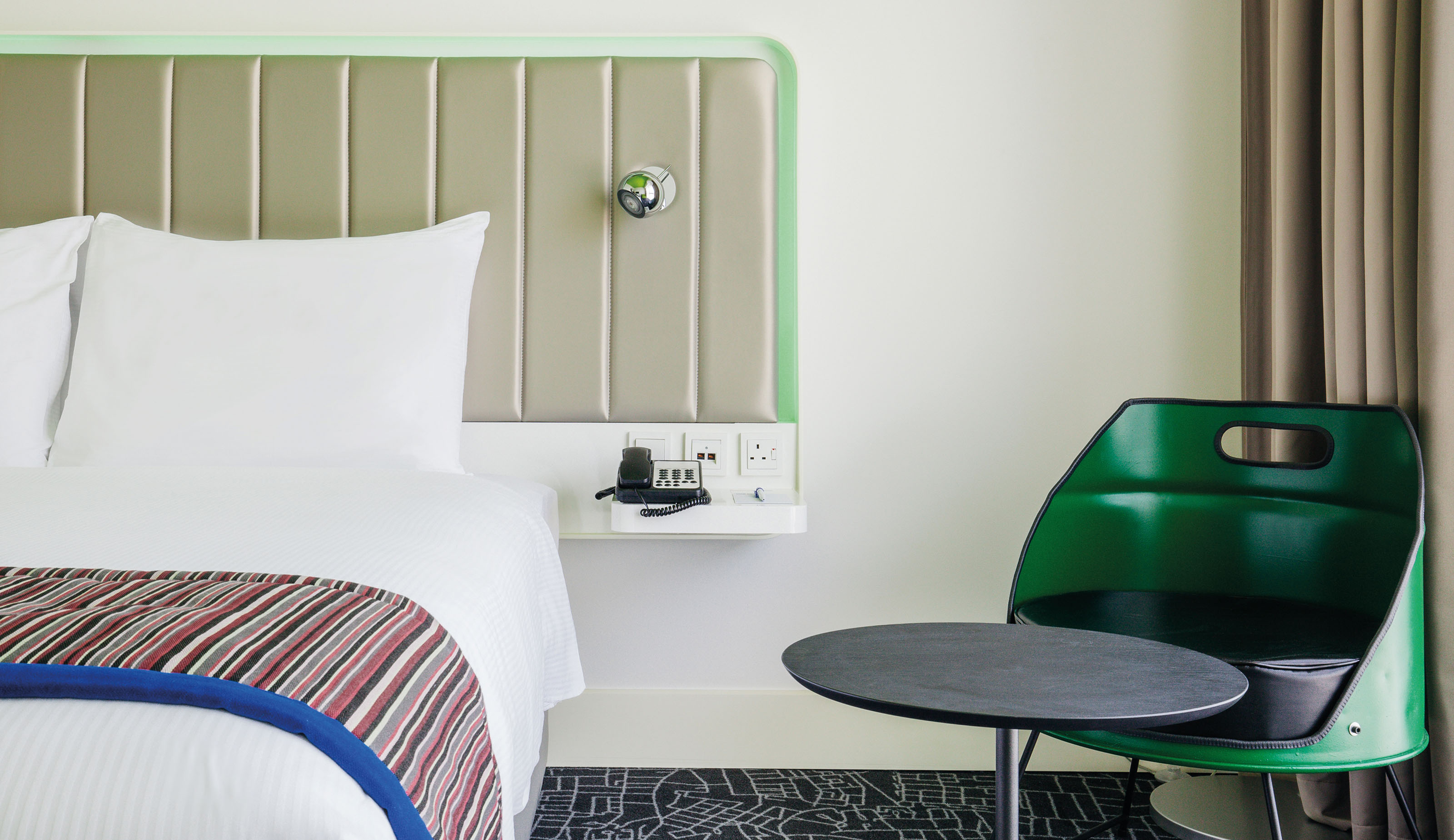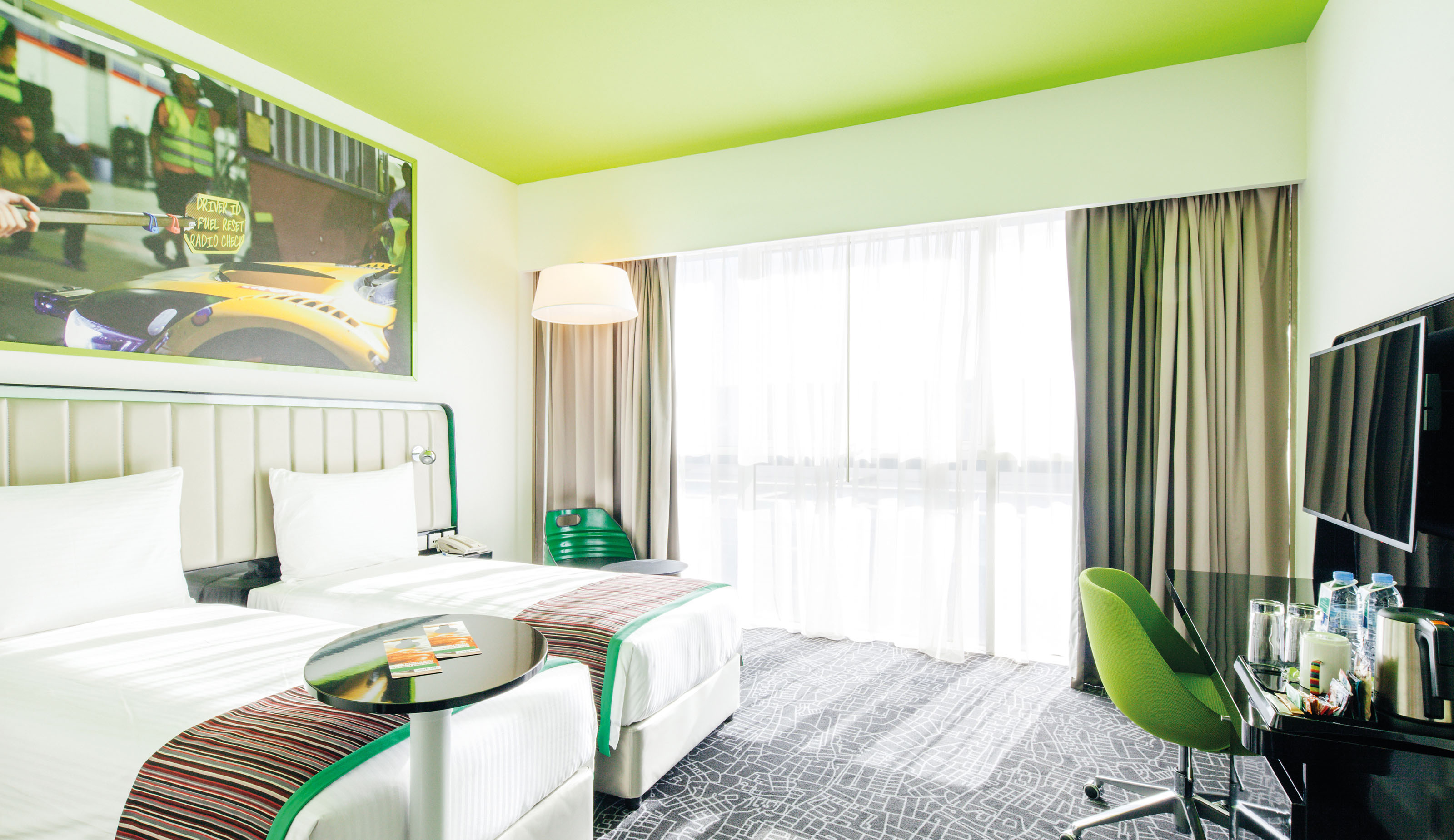 Vintage cars suspended from the ceilings, corridors that resemble a circuit with pedestrian crossings located in front of the lifts, or different car parts like alloy wheels and tires painted in different colors which hang from the walls of the lobby and restaurants give a sense of adventure and fun, all in a contemporary and relaxed setting, with a strong sense of place. With a total of 147 guest rooms units, the interior design provide continuity to the racing story, but in a more subdued manner. Comfort is the main aim of the proposal. This is achieved with brightly painted walls and a choice of playful yet colorful furniture which enhances rest after a busy day racing or sightseeing in Dubai.