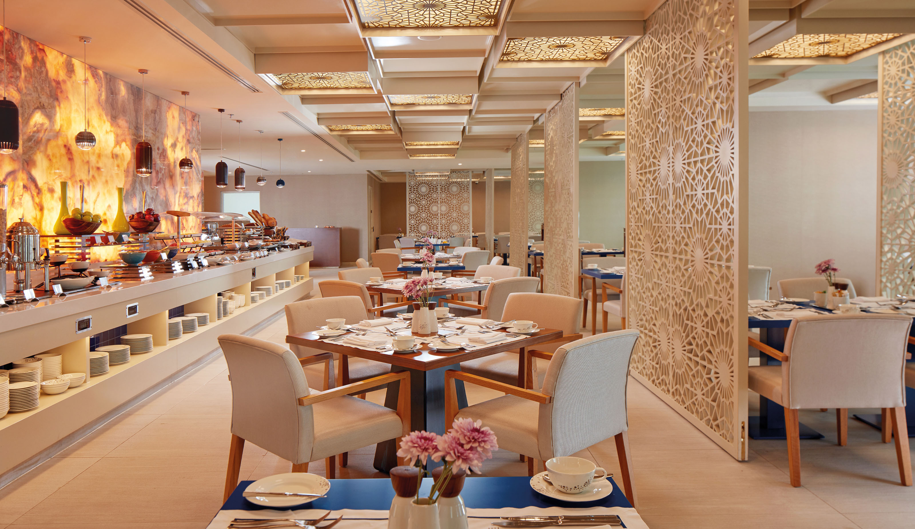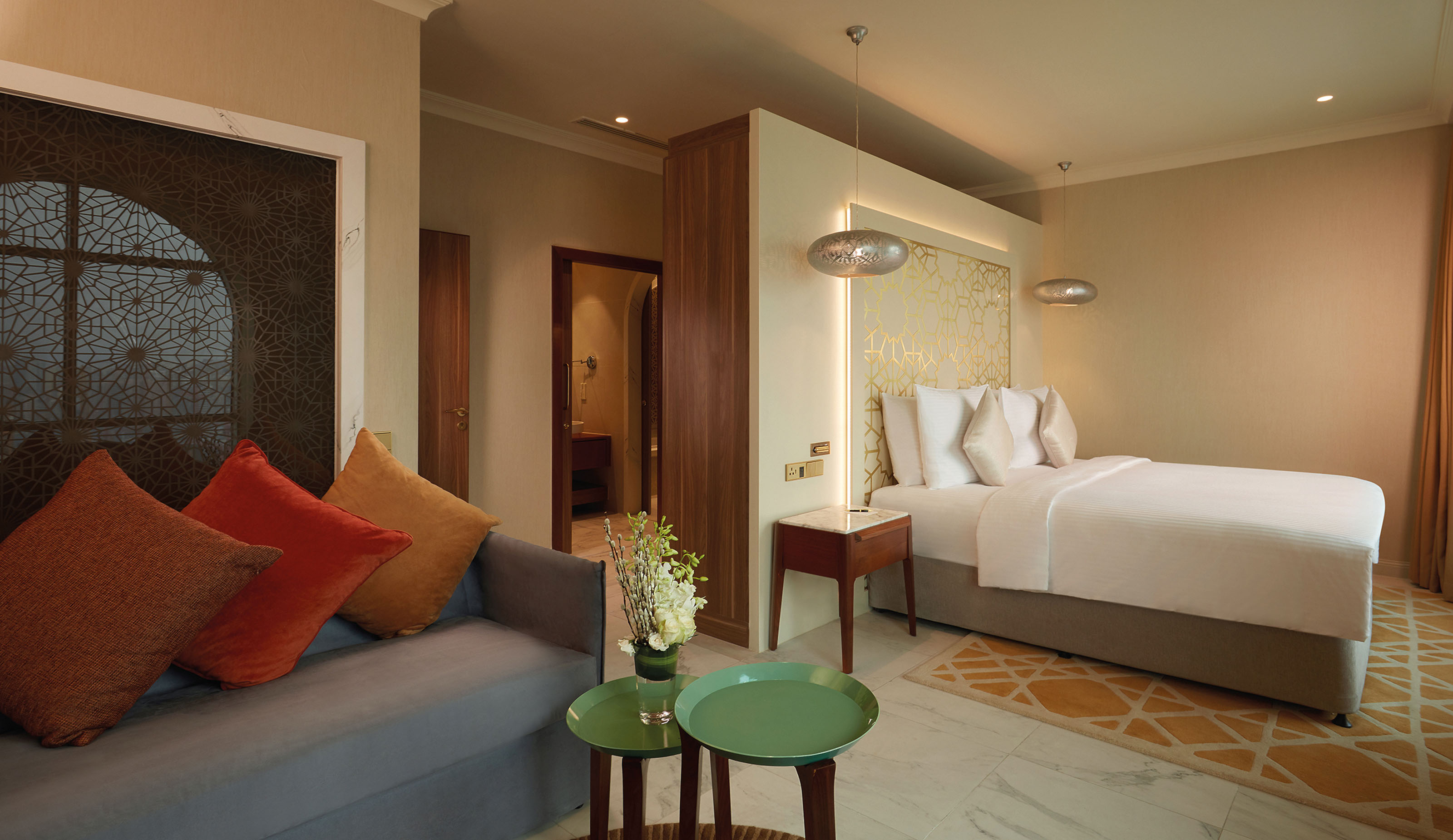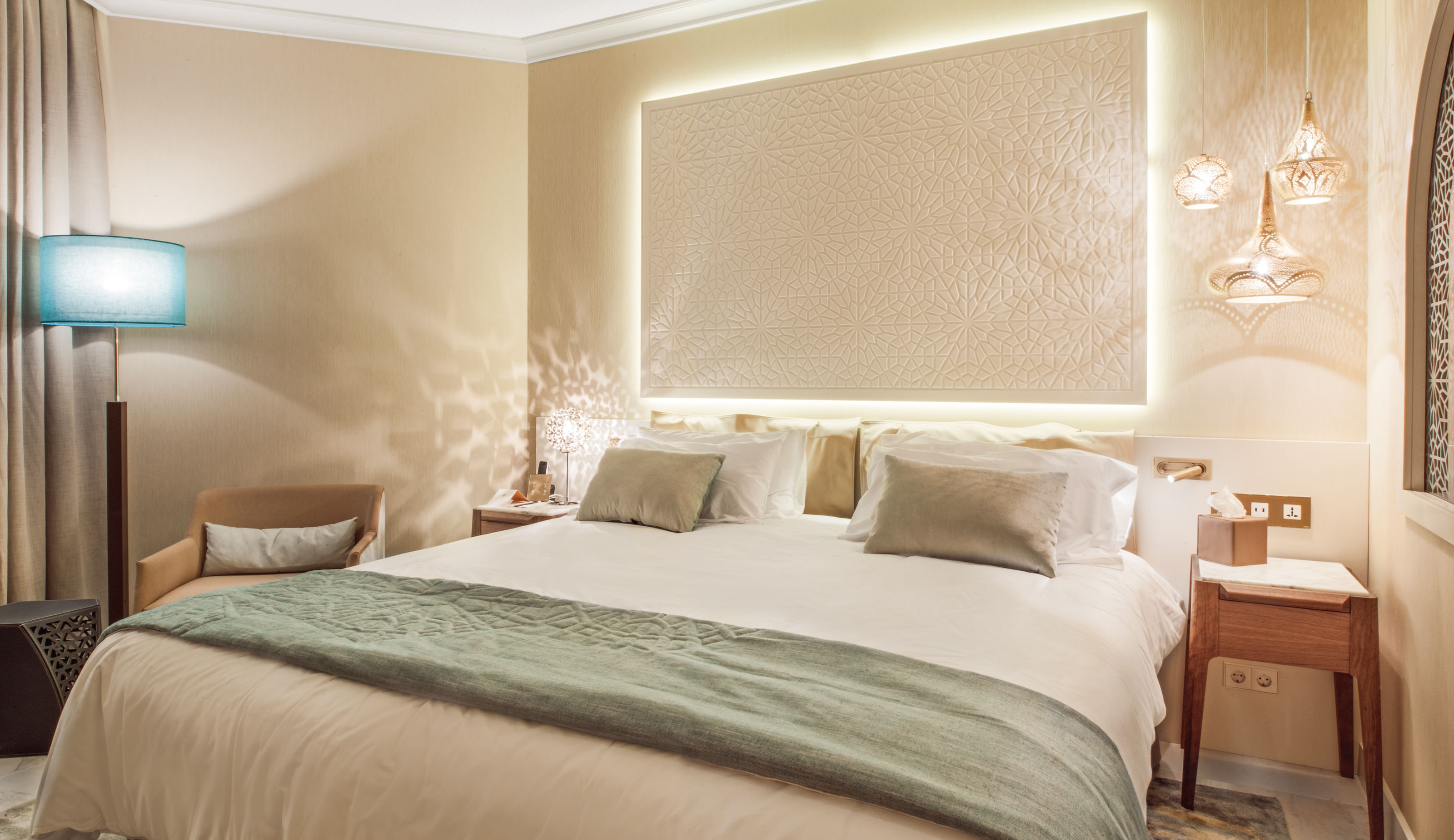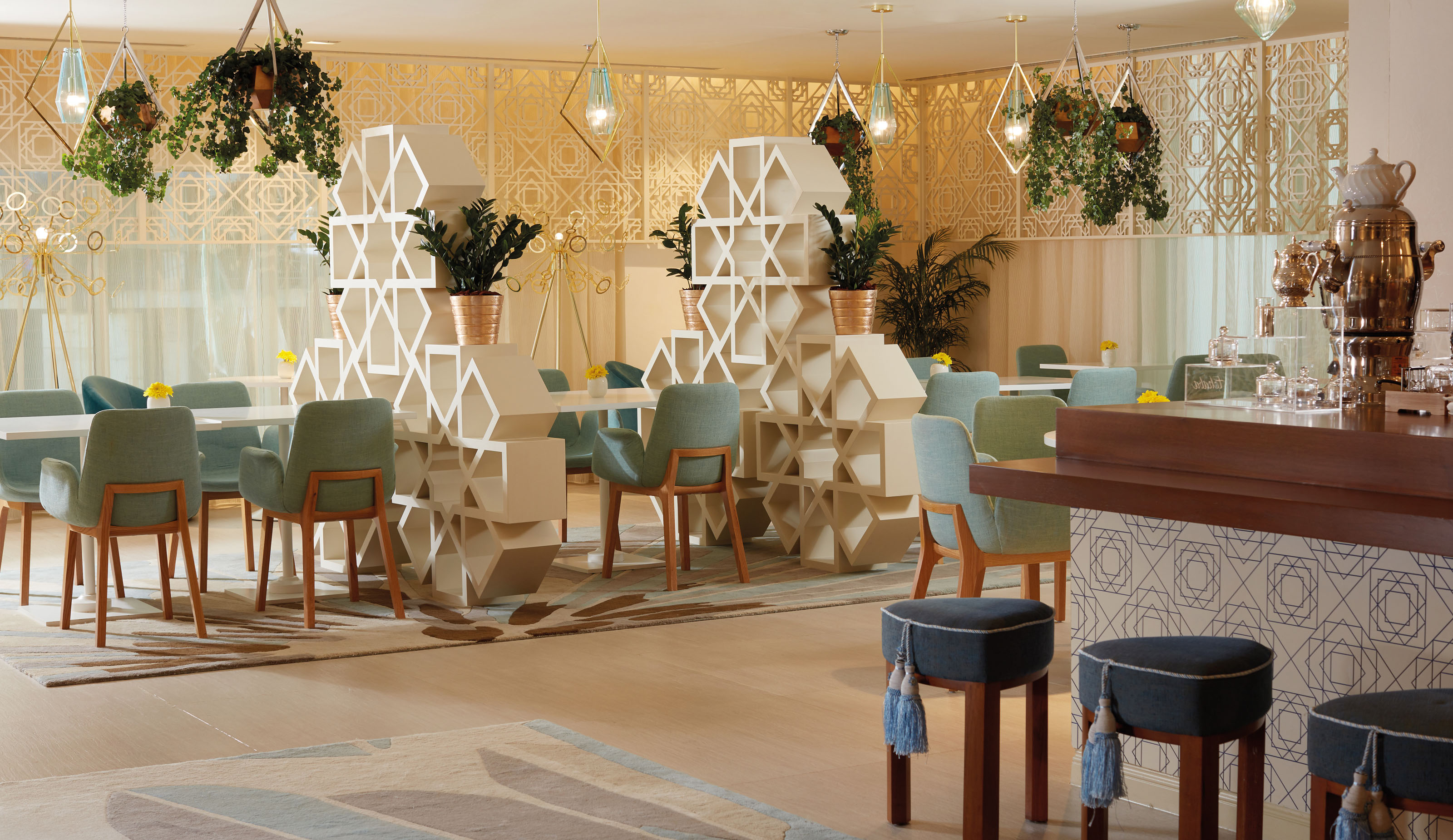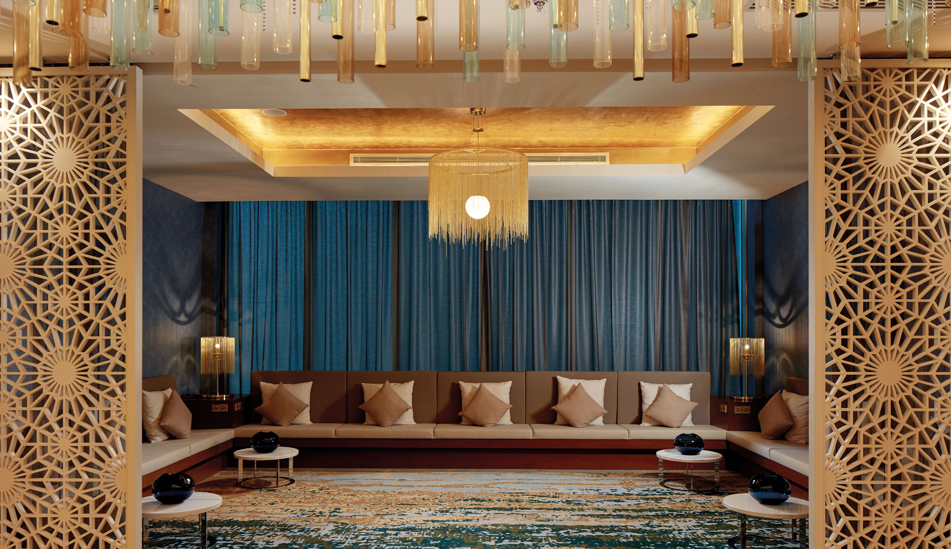 Peace and calmness are the main inspirations to develop the interiors of the spaces, both felt inserted within the atmosphere while welcoming its guests. The hotel, with 251 guest rooms follows a color narrative of cream and aqua palettes is followed throughout the inner spaces, two calming and muted hues which provide the necessary frame of mind to favor contemplation and serenity. Art, calligraphy, furniture and locally inspired motifs in rugs and lattices reinforce the sense of place, strengthen by the use of lights which multiply these Arabic patterns in walls, floors and ceilings to provide a natural continuity in the peaceful mood of the visitors to one of the world’s most venerated spots.
