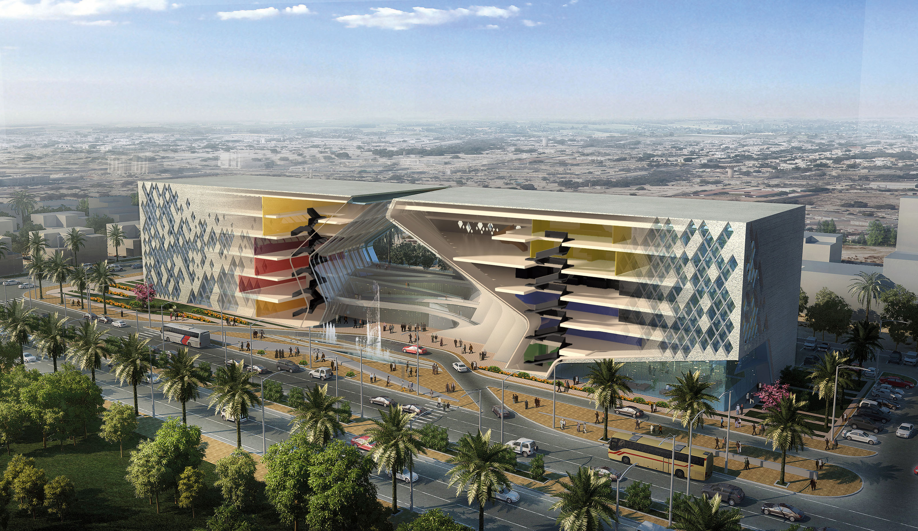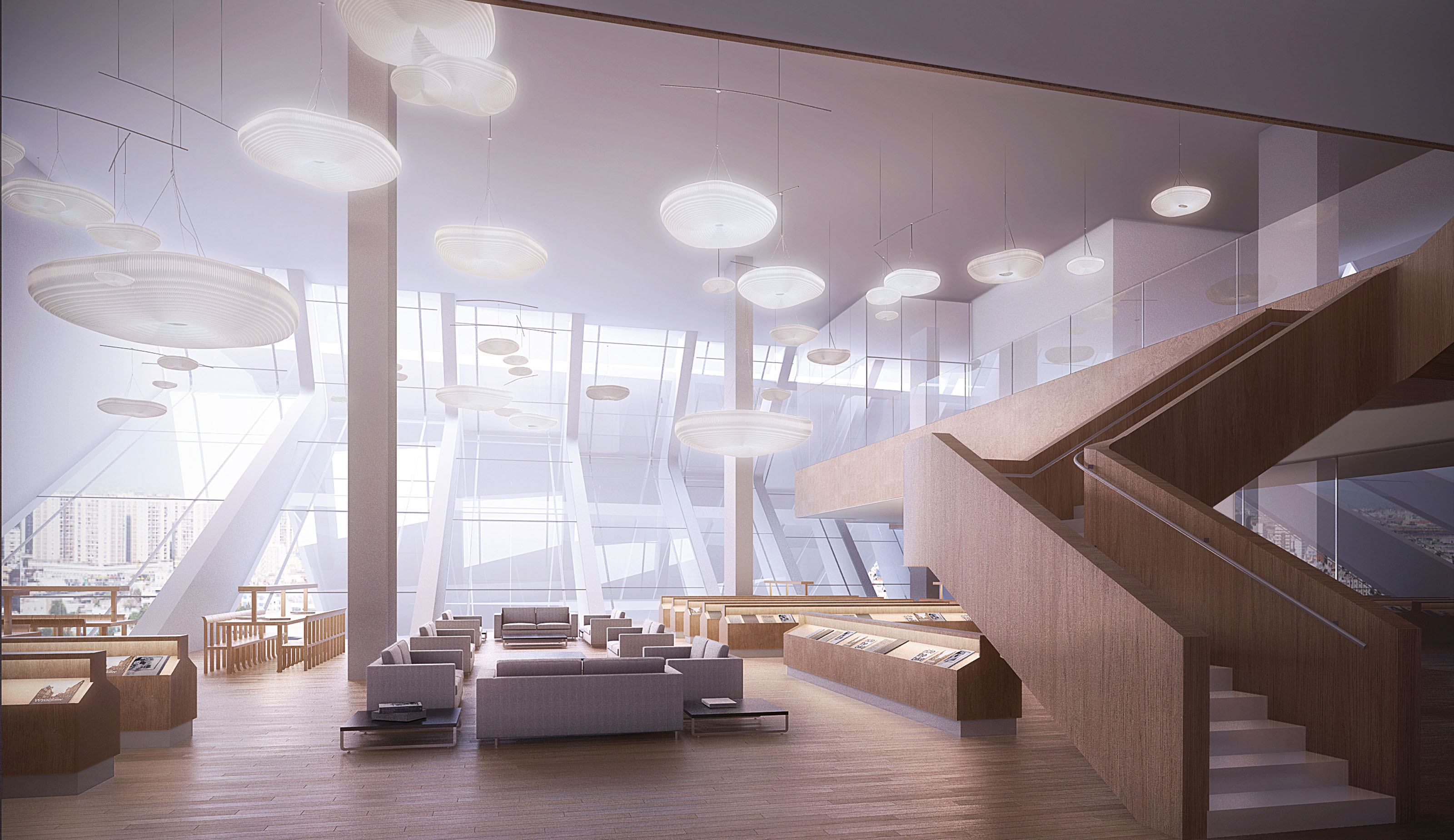 Given the extension of the building, one key issue was to fill the massive spaces with natural light. This is achieved through the diagonal-shaped openings in the facade, which resemble dots in Arabic Calligraphy, and allow plenty of light to enter the space. This is mimicked by the light-toned wood handrails which are designed with a similar zig-zag to those of the openings. This calligraphic reference is a remark about the position the city enjoyed as a great centre of learning and theology at the beginning of its history.