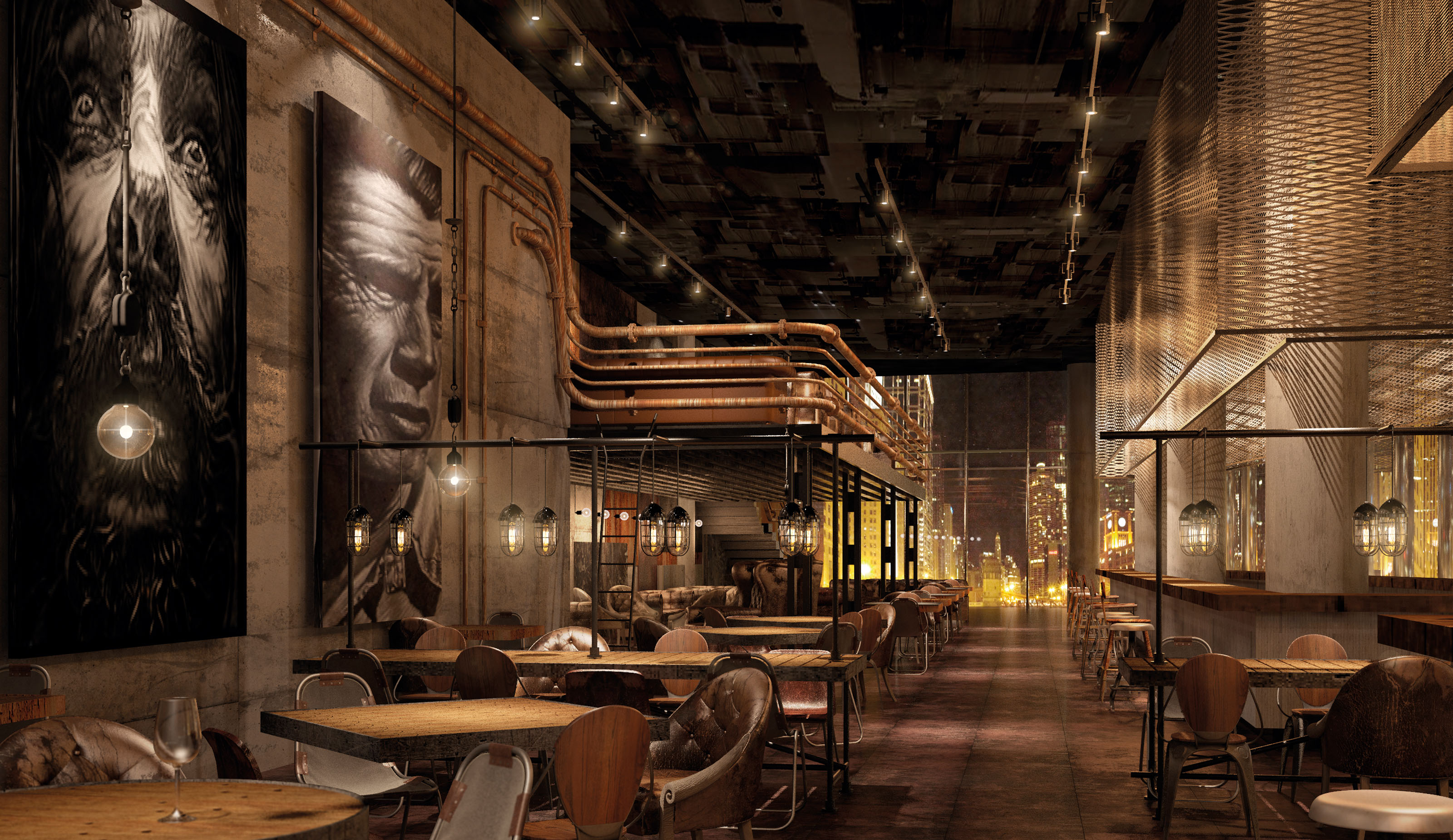 The use of pipes, concrete, exposed installations, metal mesh and plates, vintage furniture and lighting mark the industrial-vintage style of the place. Another key element in the decoration is the graphics, Stefano Alcantara’s paintings / photo impressions with their size and content.
