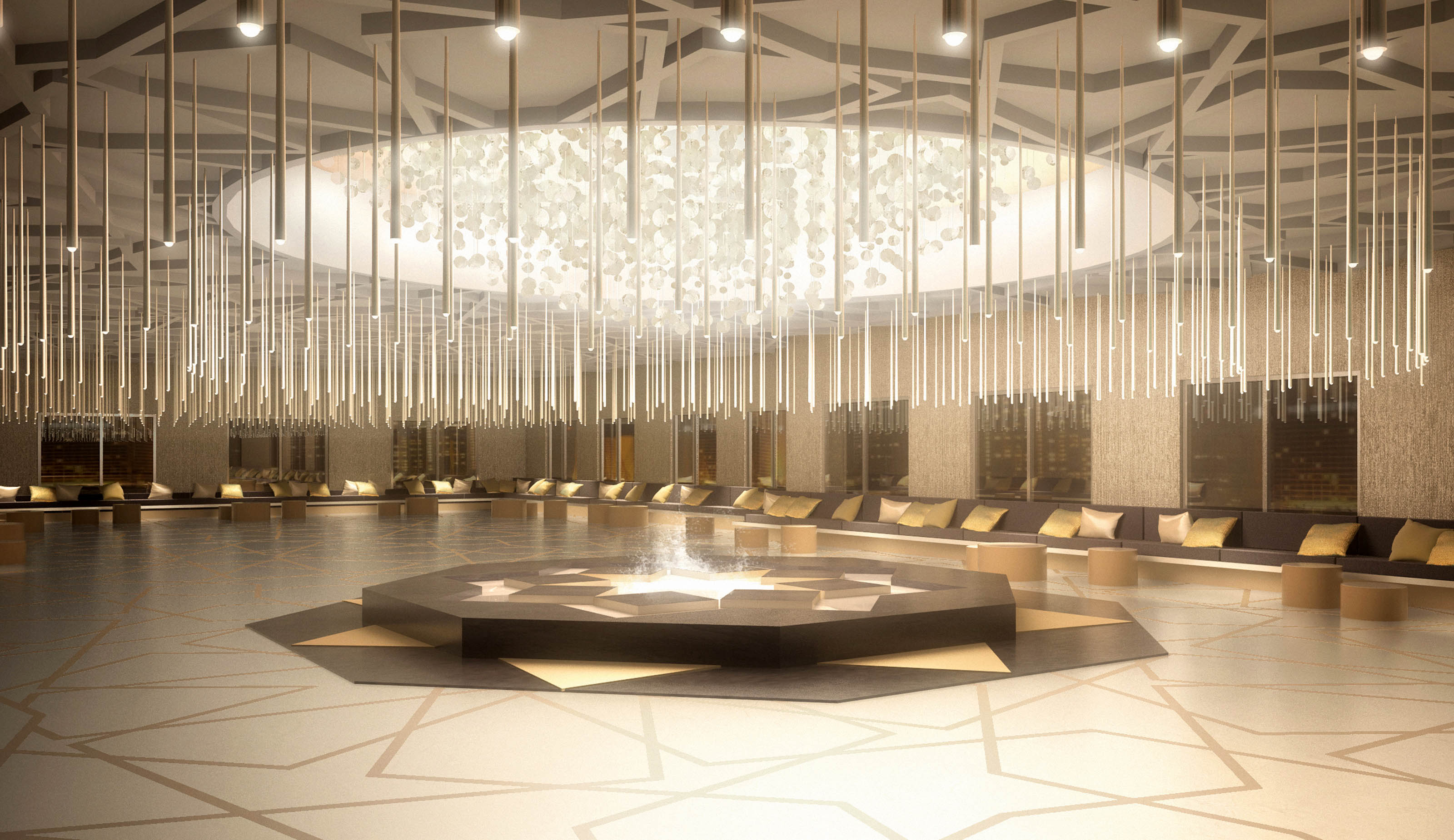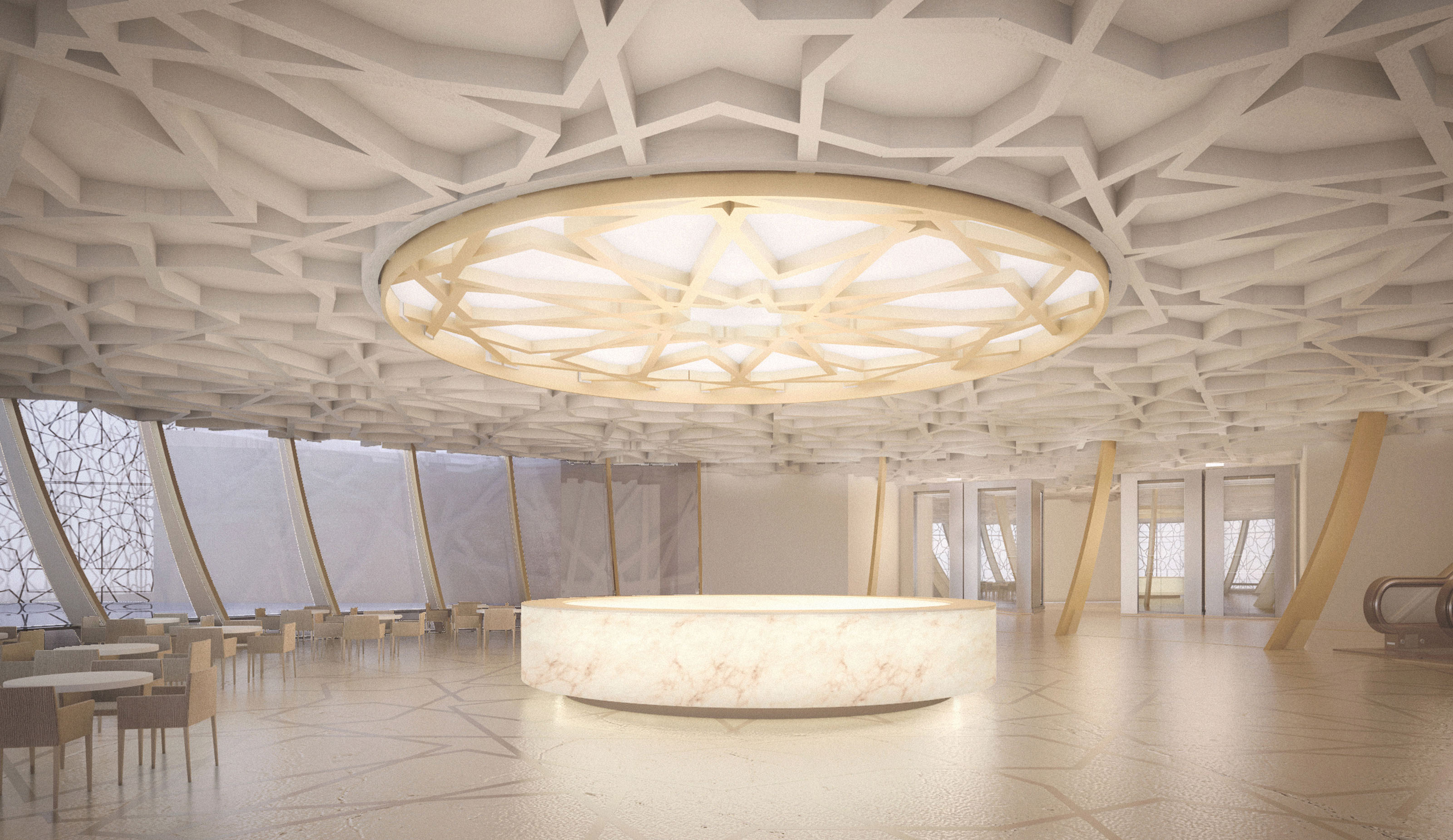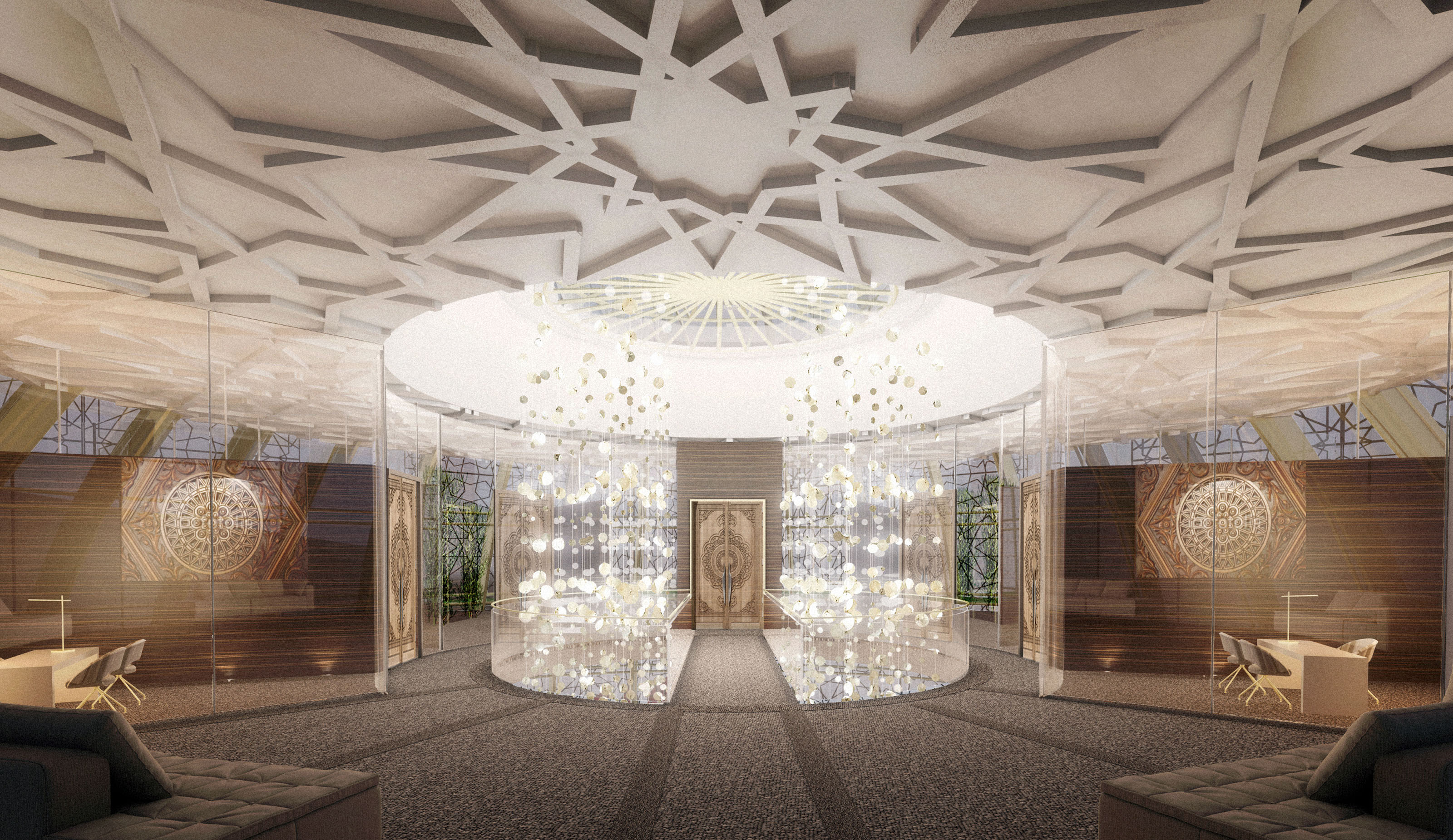 Arab patterns are found throughout. Wooden lattices in the main lobby span a few meters up to provide a decorative box complemented by the geometries on the stone floor and the jewelry-like pendant lights. The Majlis, a space for reunion and debate, is arranged around a circular ceiling which is the source of illumination, originated by sculptural-shaped lights which descend from the geometrical ceiling. Overall, the interior design strives to spotlight the cultural and commercial pride the Chamber of Commerce wants to transmit to its members when representing them and their industries regionally and internationally.