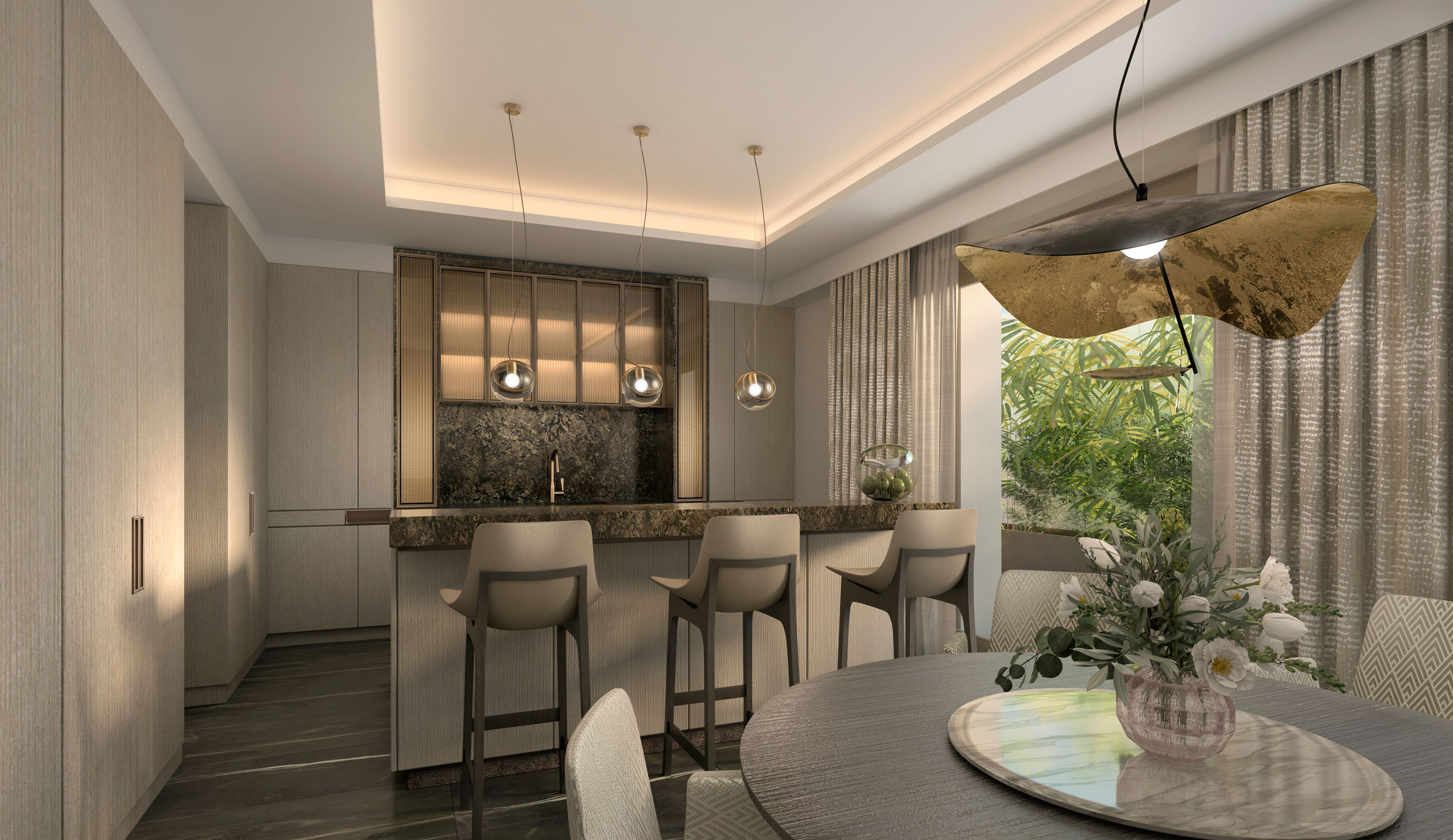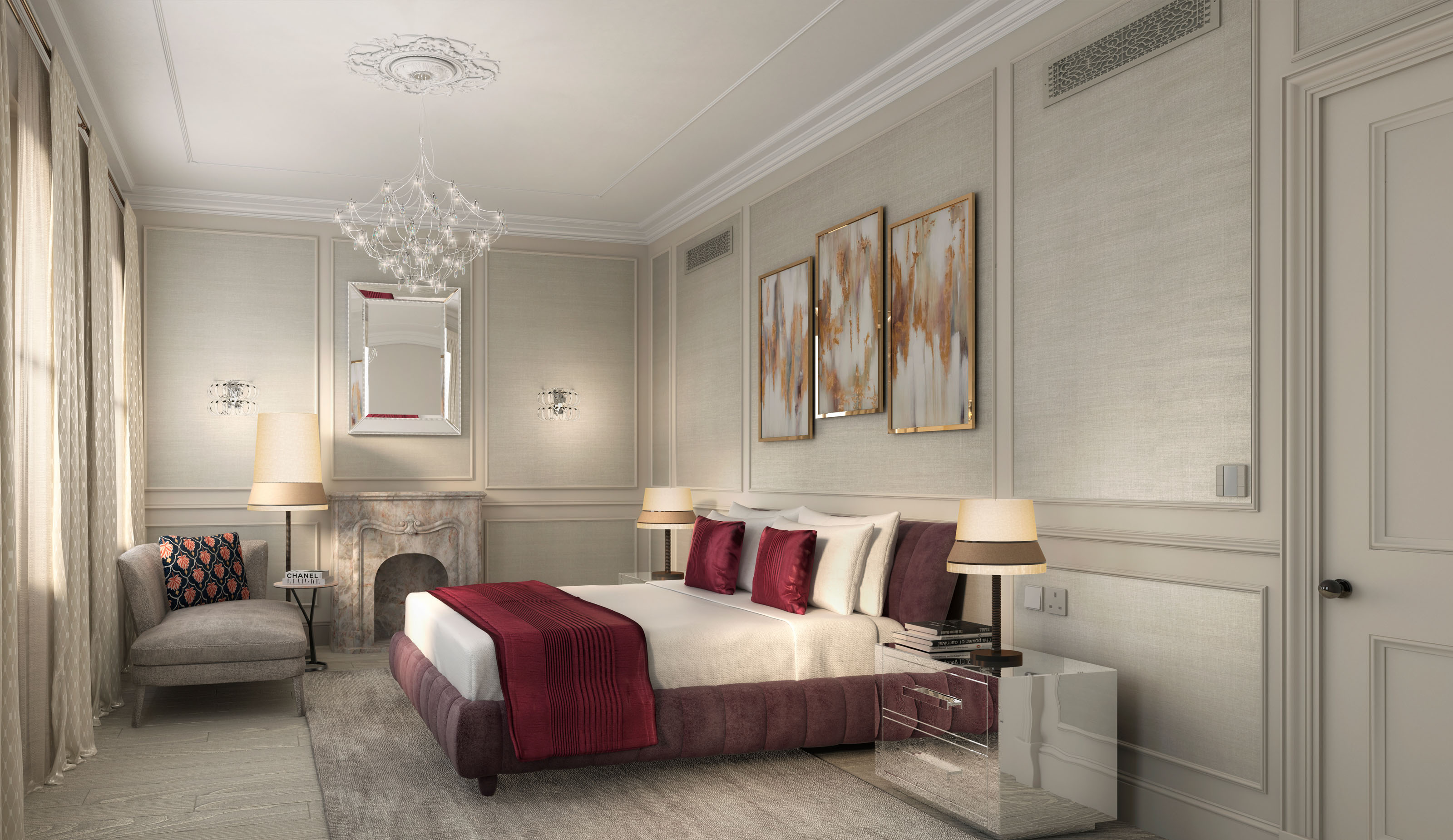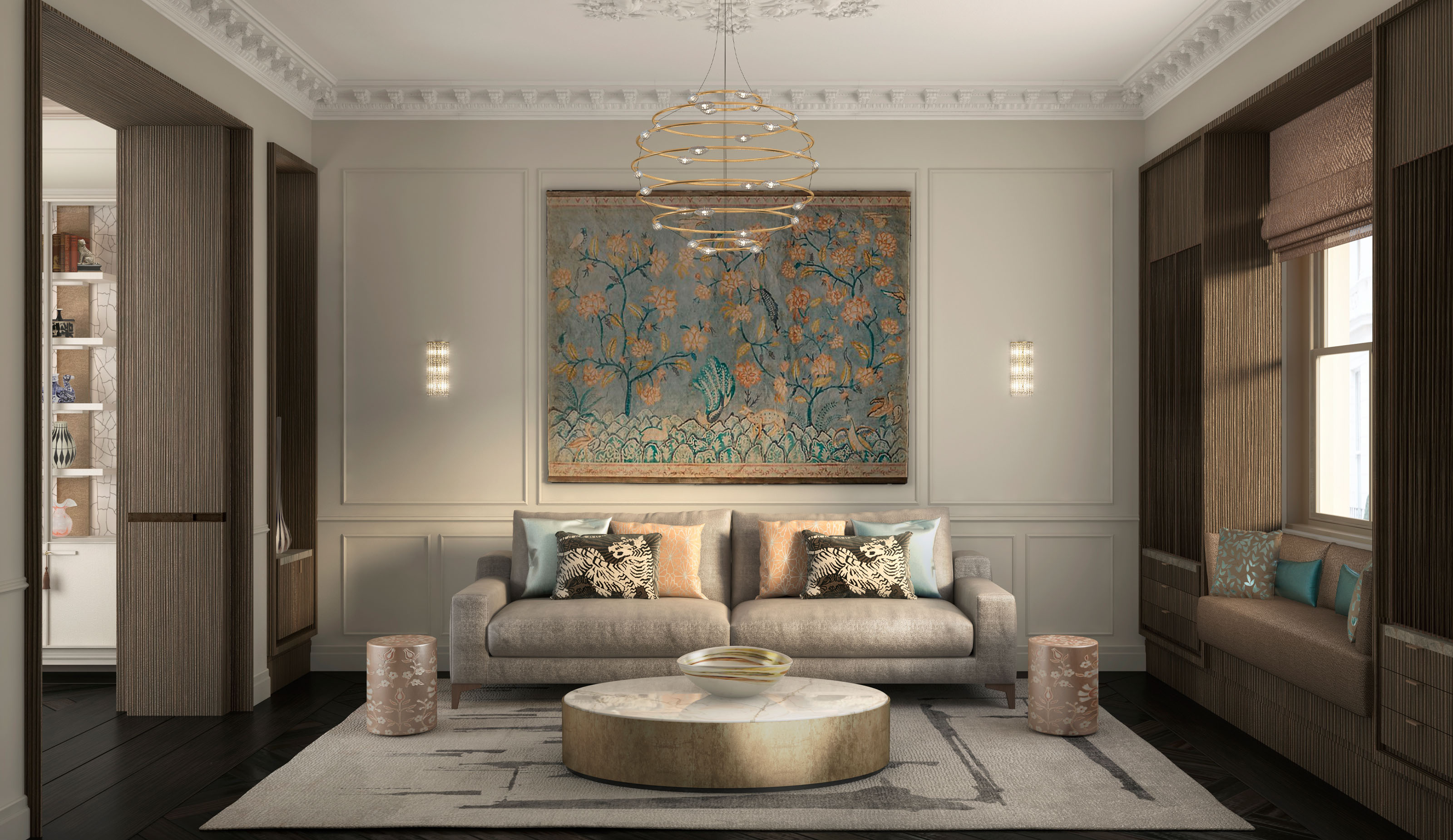 The design intent proposes materials that match the high-end quality of the property, with rich yet sober textures and elegant details such as classical mouldings and wall panelling, though maintaining a modern approach to create a harmonious blend between the old and the new which embodies this building. Parquet flooring, stone-cladded fireplaces, intricate cornices, ceiling medallions to frame state-of-the-art chandeliers, silky wallpapers and bronze ironmongery, mixed with sophisticated modern furniture pieces and decorative accessories, form the well-dressed atmosphere sought for the spaces.