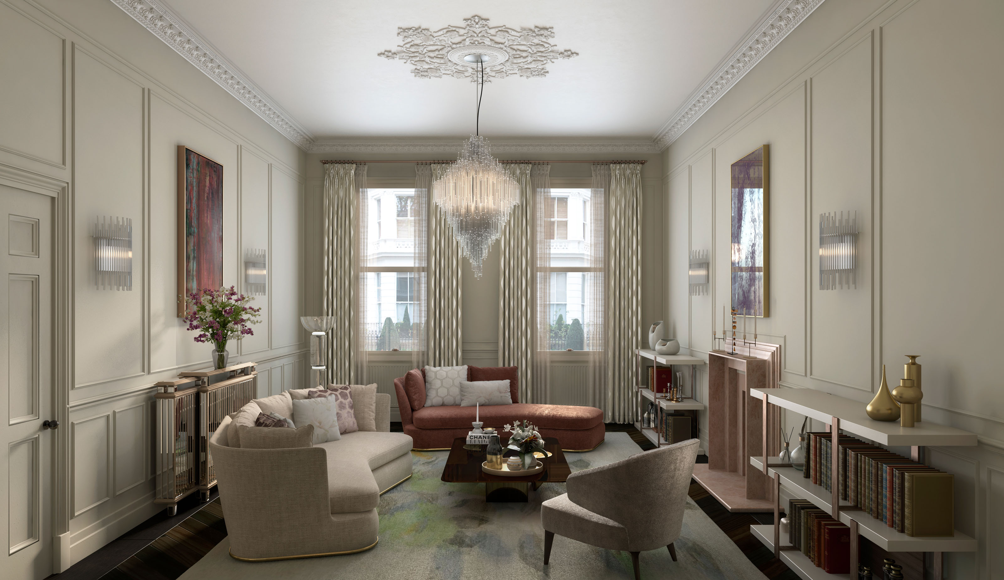 Located in Central London, Eaton Place consists of the refurbishment and design of a high-end property. The program includes the selection and proposal of finishes, which would be presented as Marketing material to prospects through 3D visuals and physical material sampleboards, as a possible interior design offer to dress the white box of the interior spaces.