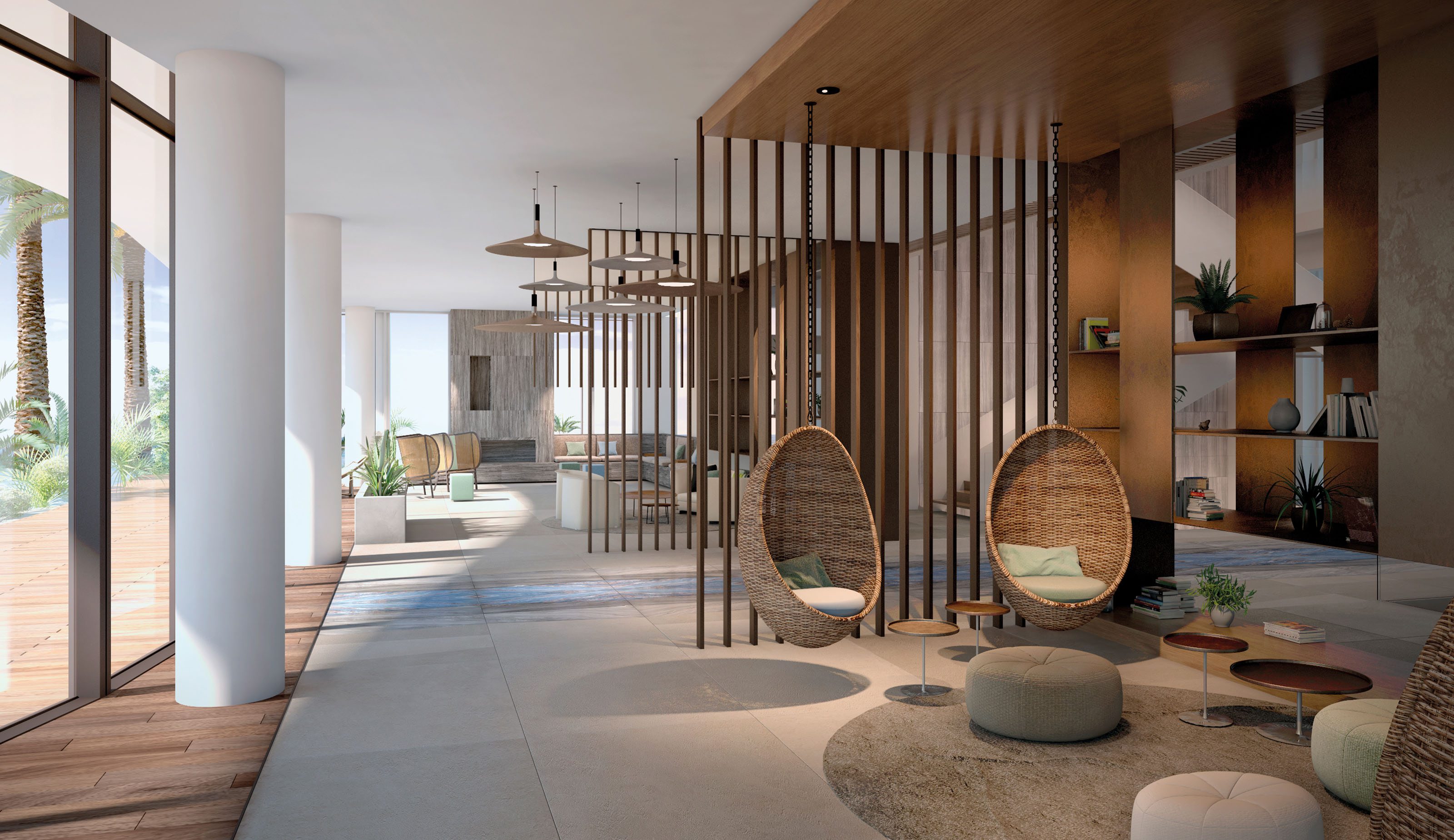 The villa enjoys a privileged location, facing the city’s skyline from the front façade and the sea from the rear side of the building. This is a private house composed of a basement, ground floor, first floor and roof. The interior design concept focuses on the openness of the spaces, dominated by straight lines, and the access of sunlight through the glass walls. This is specially relevant in the living room space, where a series of thin wood partitions create separated atmospheres decorated with locally inspired furniture, lamps and rugs across the large space.