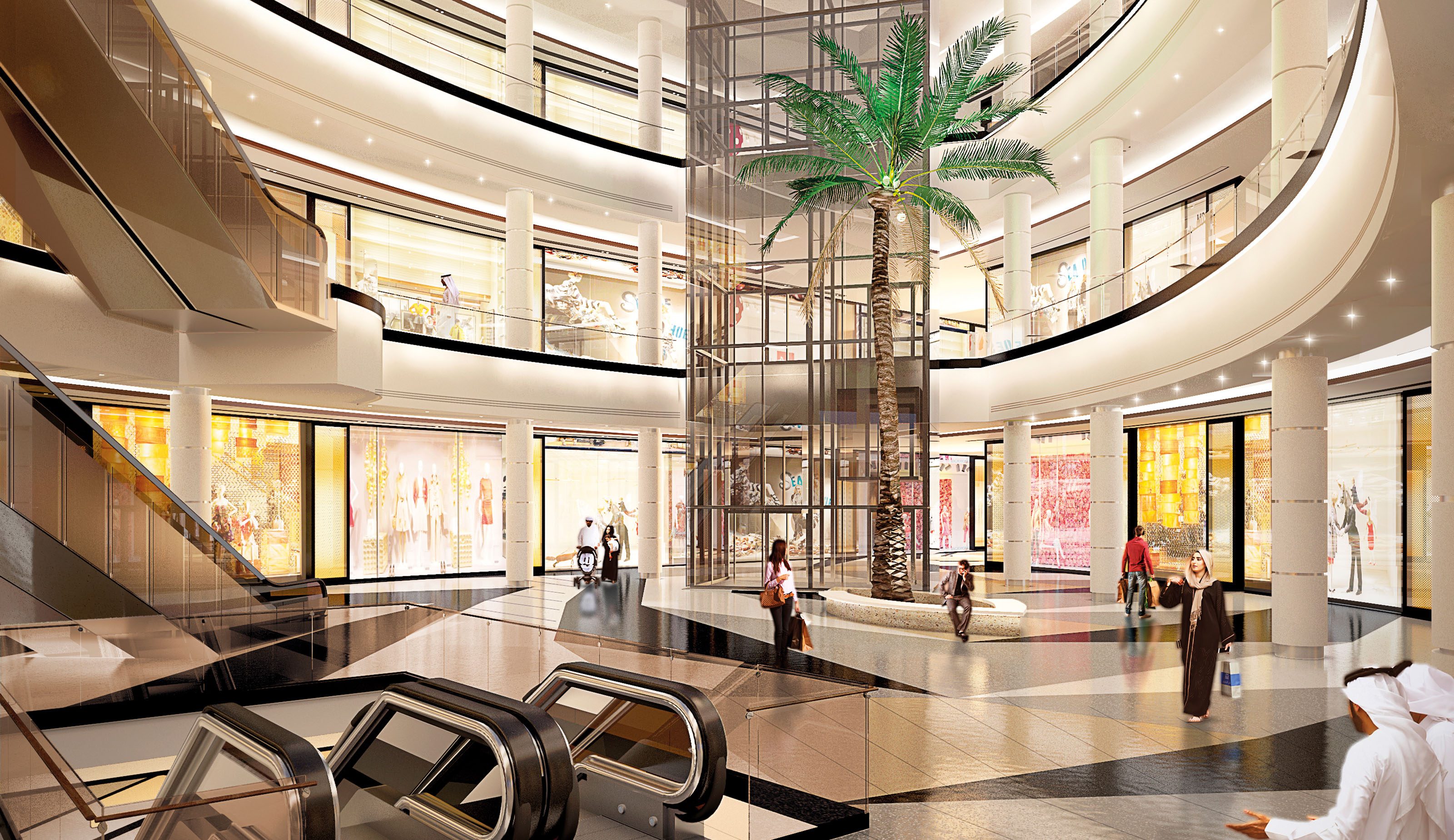 The Transition Zone links both developments. This bridge welcomes and guides visitors to the new expansion and has the same spirit as the existing mall. A warm and dynamic atmosphere is achieved, with inspirational elements like the desert references present in the fine dining area which provide a cozy space by combining warm textures, palm tree shapes and a touch of bright colors with natural light coming from the roof skylight.