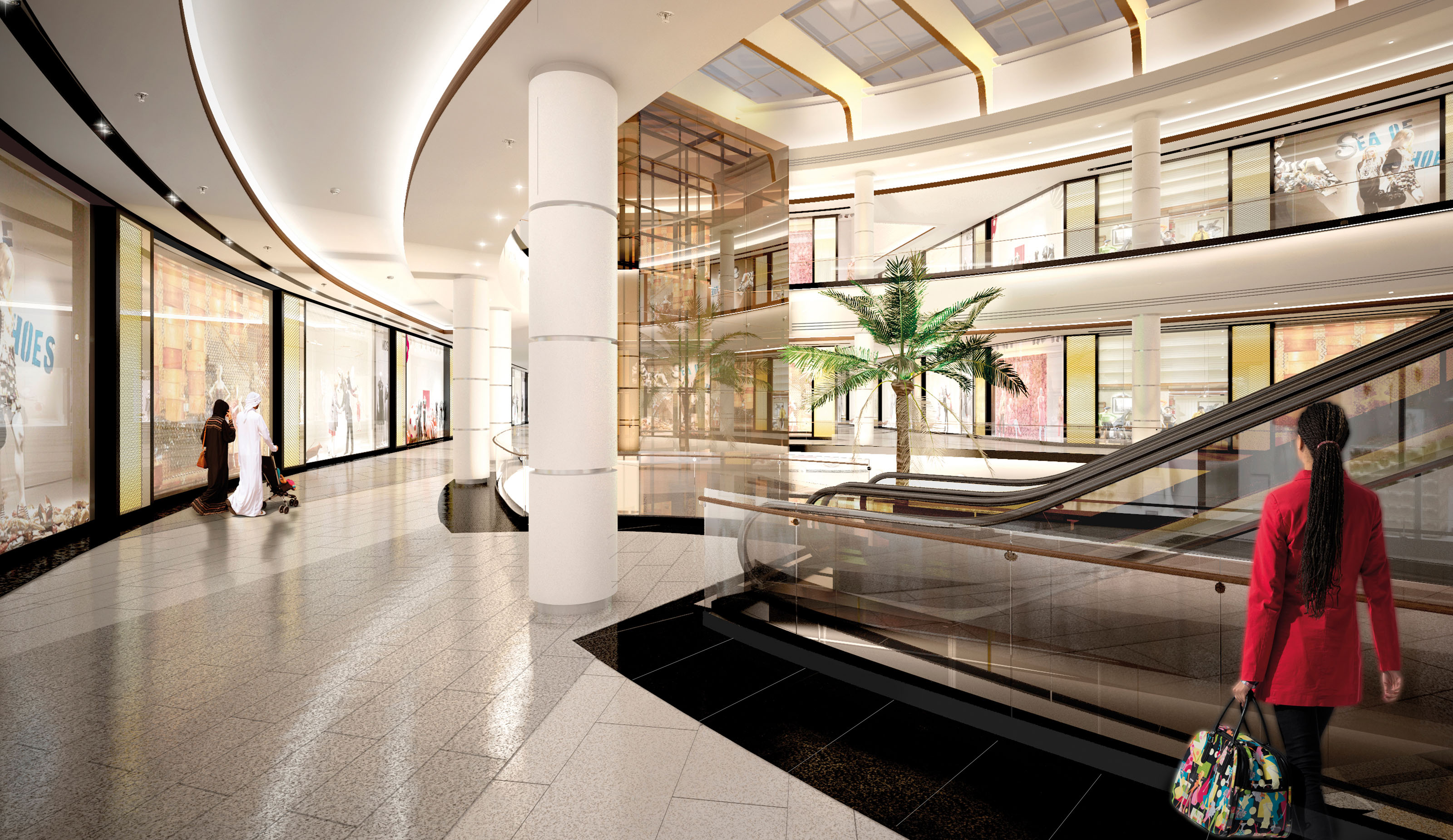 This project is an expansion of the existing Sahara Mall located in Sharjah. The design seamlessly links to the existing shopping mall, making way for a wide range of high-end retail spaces to attract a more diverse and international mix of shoppers. Located in the heart of Sharjah, it acts as a focal point for shopping, meeting and relaxing. The interior design is inspired by the beauty, colors and textures of the desert, applied in a way that the new spaces are understood as a continuity of the existing Sahara Mall, which represented a design challenge from the beginning. The program includes the interior design of all public spaces inside the New West Extension and for the transition areas: mall corridors, public toilets, lift lobbies, prayer rooms and the clinics module which has a separate entrance.