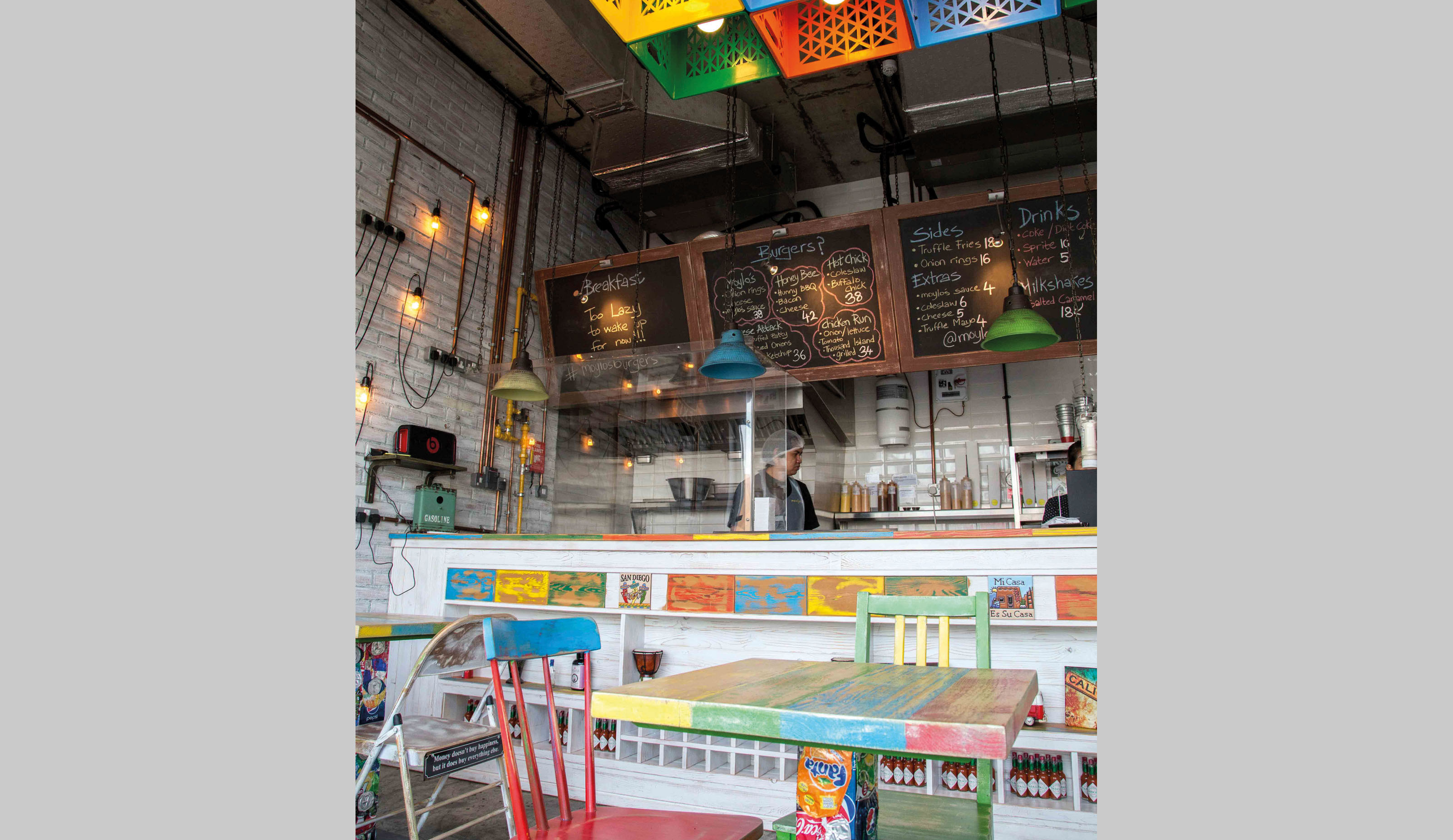 Streetburger bar and grill restaurant for MOYLO’S in Jumeirah, Dubai. Full concept developed for a new chain well as food truck and tuk tuk. All materials used are recycled or reused.