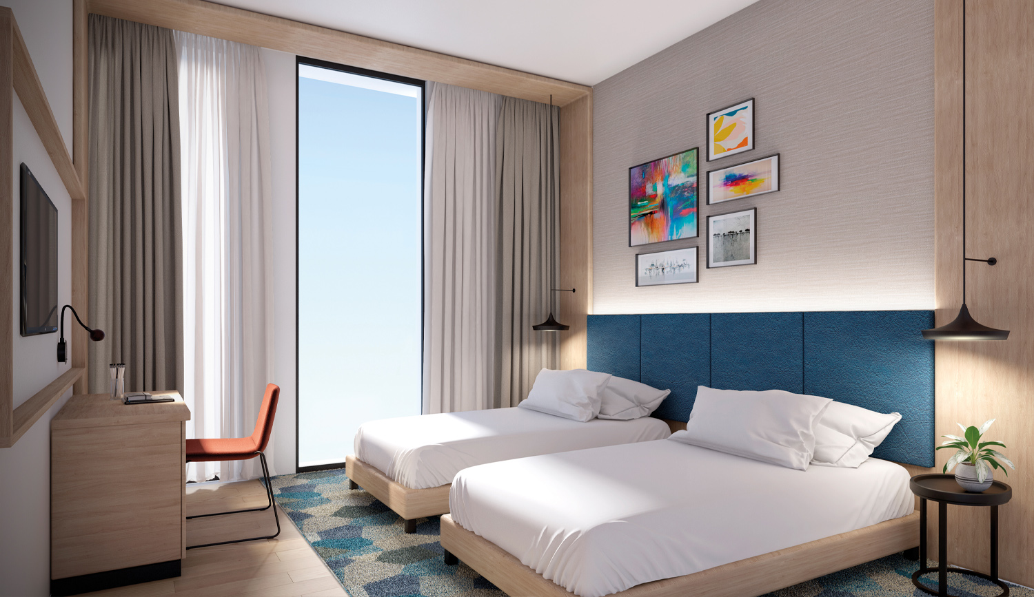 Main lobby is inspired by framed spaces that interact with each other, allowing that the open concept hotel to take place. When entering the lobby, vertical elements and feature walls welcomes the guests. Earth color palette, that vary from green to blue green, and accents in dark grey or light copper tone. Greenery as ornament elements are present to living room atmosphere. Frames elements give niche corners and privacy to the open space and they create comfortable and pleasant experiences for the guests.