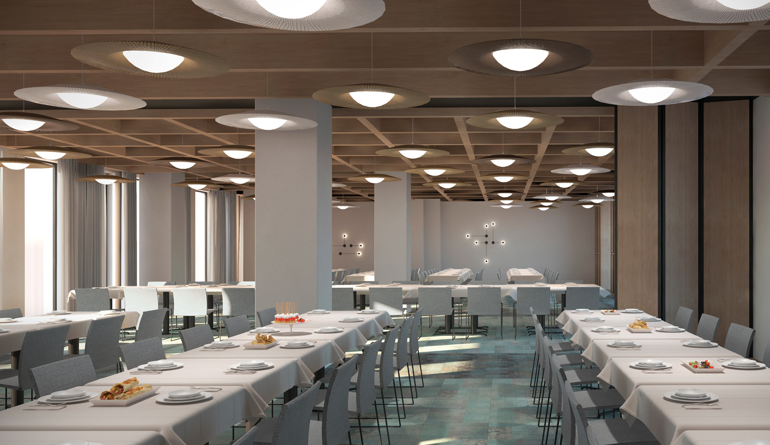 The All day Dining maintains the overall idea, such as linear and clean surfaces with an interactive and open plan for a better circulation. Variety of seating zones types offers flexibility. Additionally the use of batten panels and green walls creates a warm and elegant atmosphere and also provides an acoustic comfort in an ADD with large dimensions.