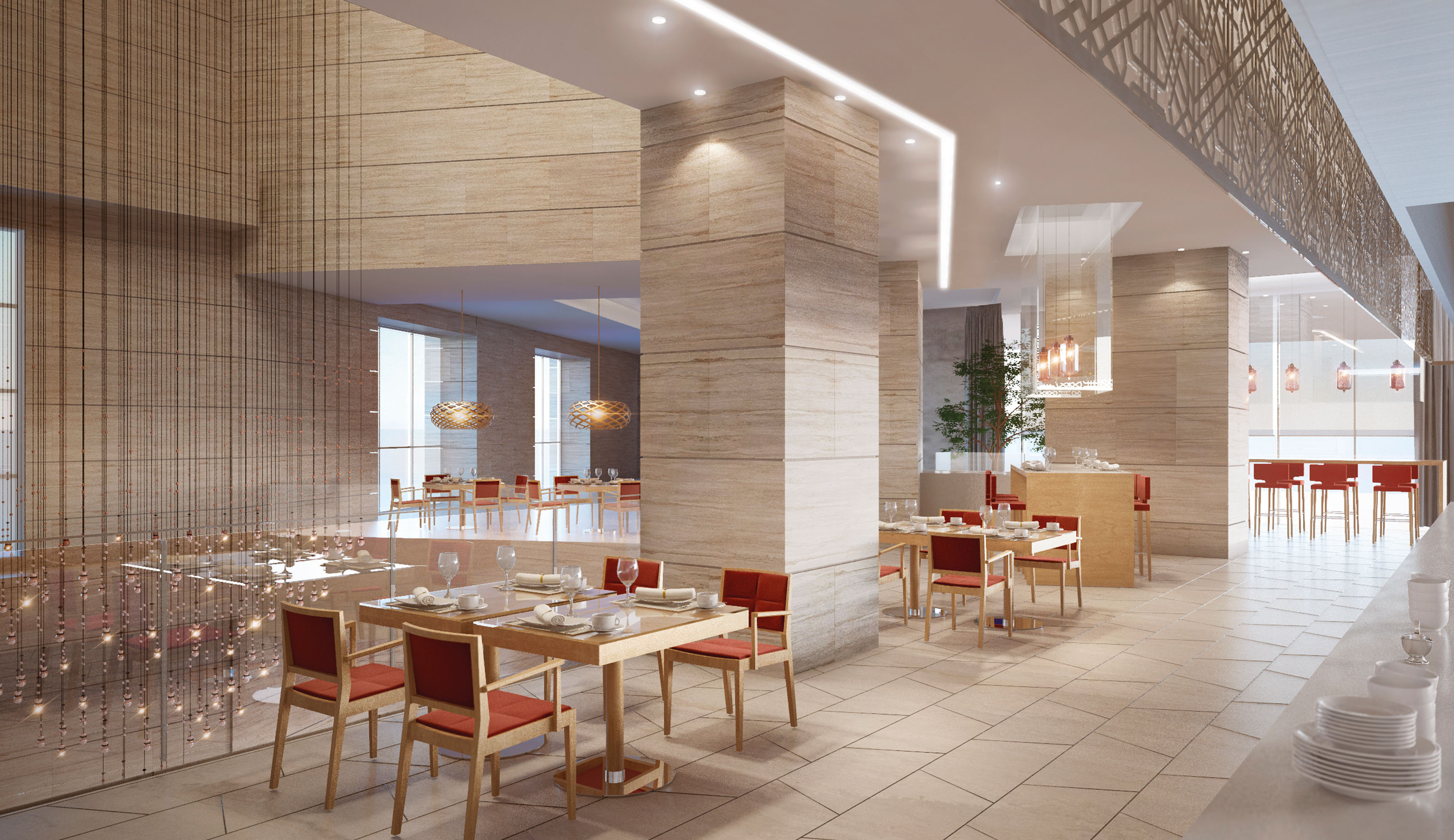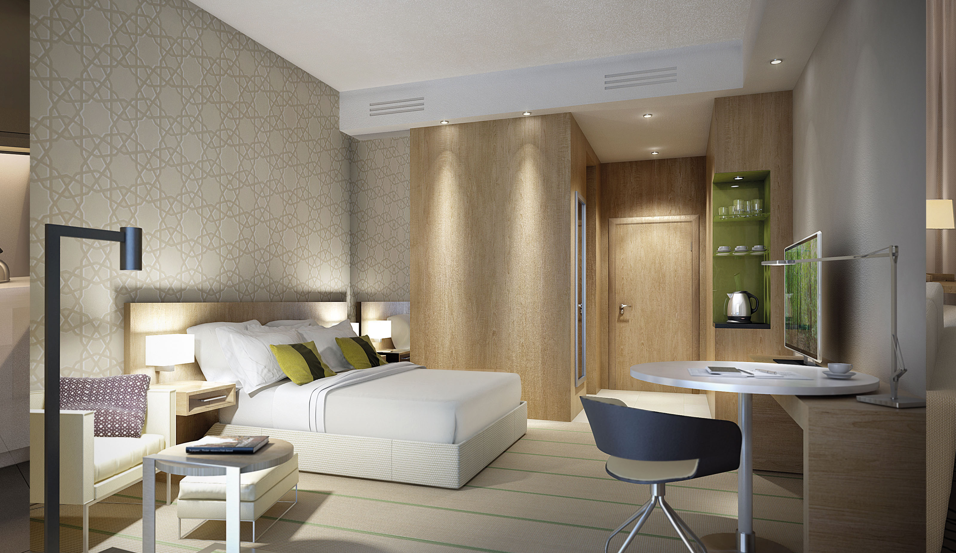 This idea is materialized by emphasizing wide spaces which also manage to provide a degree of intimacy for the guests by strategically placing furniture and decorative structures built in natural materials such as wood, achieving the desired level of discretion. In the rooms and apartments, a more neutral yet equally distinctive approach is taken, with a continuity in terms of materials yet highlighting a relaxed atmosphere through the use of furniture, textures, decorative elements and a neutral and fresh color palette. The program also includes the interior design of all FOH areas: main lobby, cafeteria, ADD, prayer rooms, business area, ballroom and pre function area, gym and spa, and 120 residence inn apartments units.