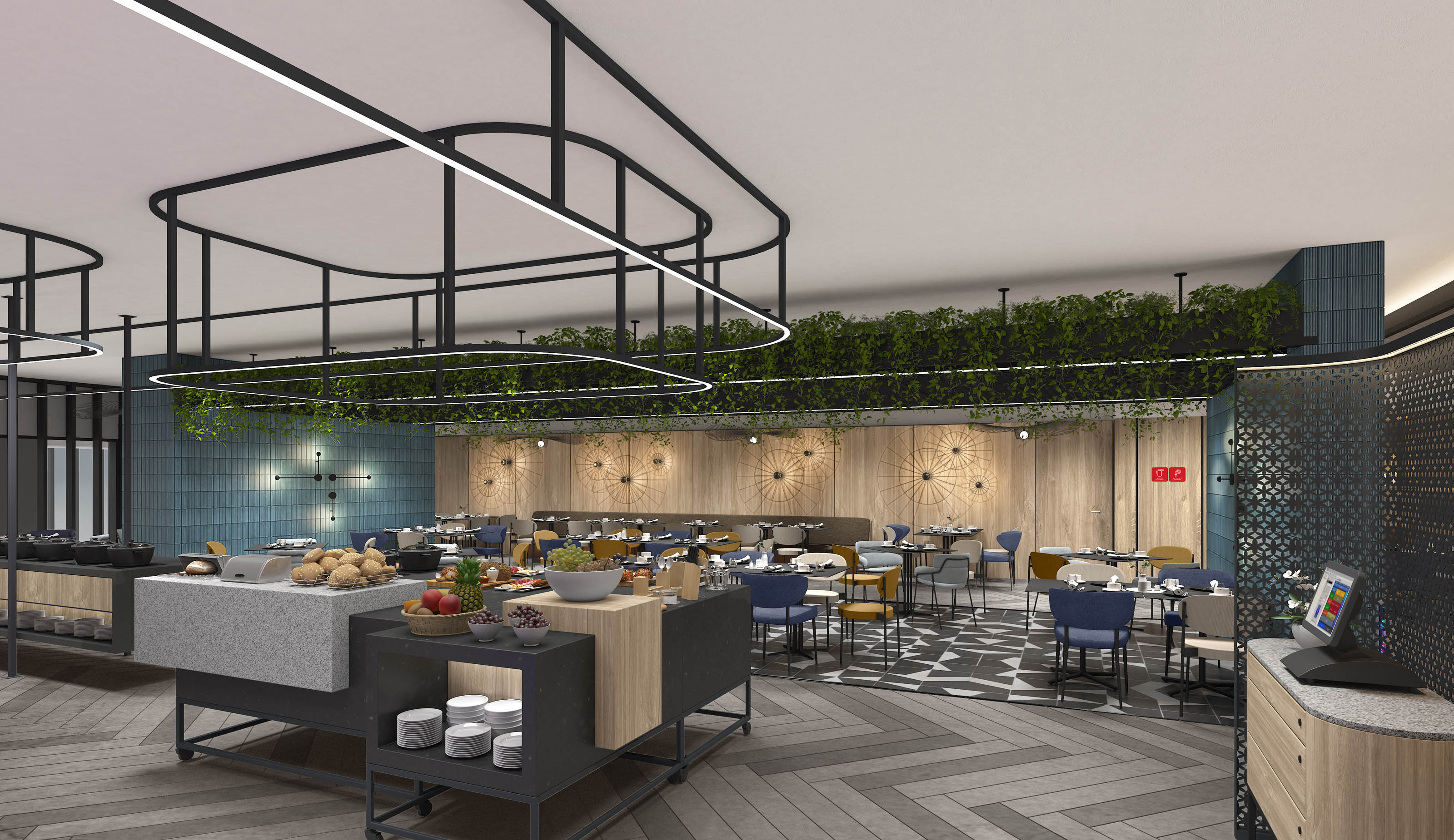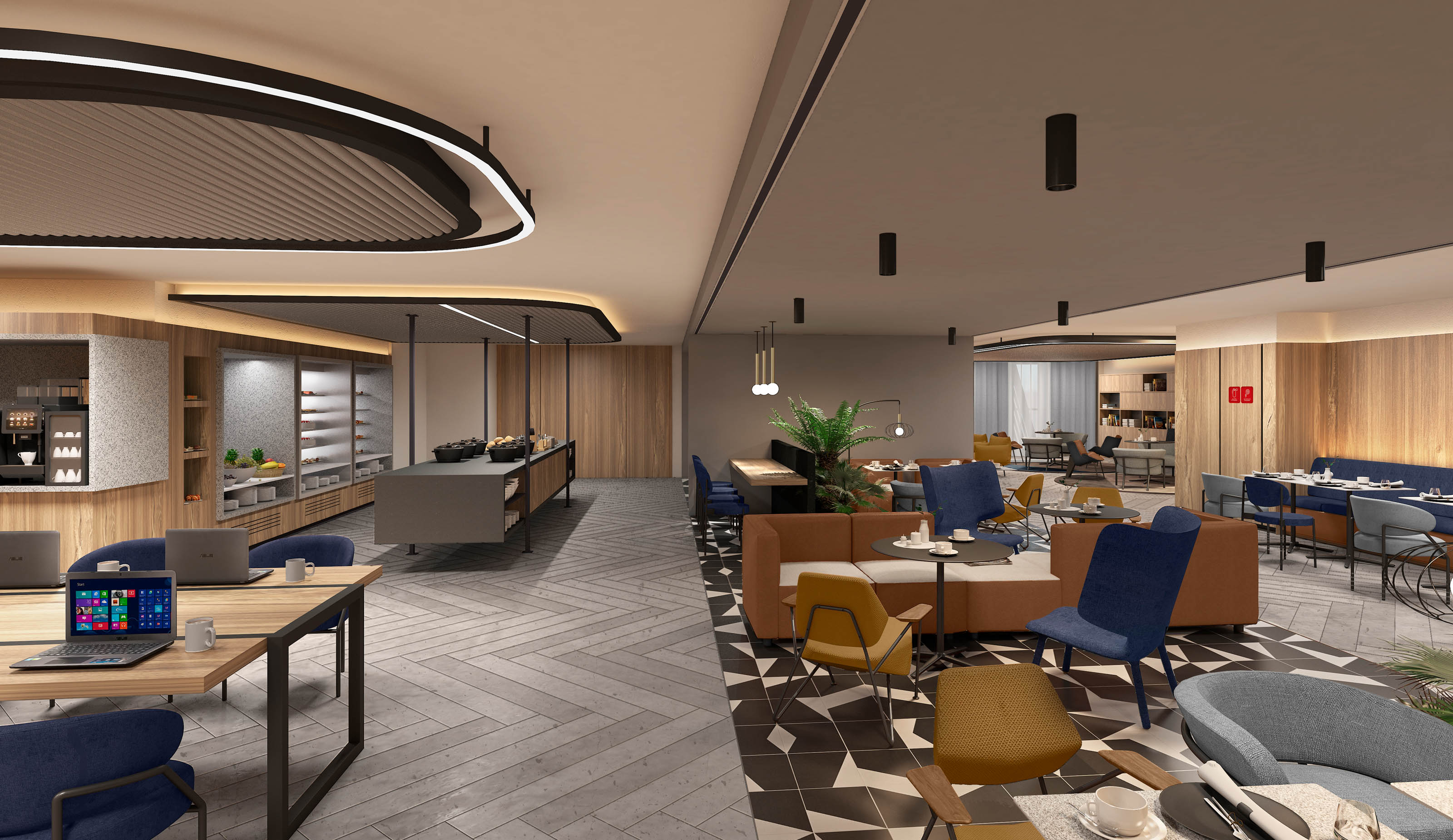 The design proposal is based on combining extensive areas of color with delicate black profiles. This “framing” effect is also achieved with light profiles that divide the different spaces within the same room or frame a particularity within the space such as the buffets within the ADD or a specific sofa area within the informal meeting. The combination of the natural texture of the wood with the geometric patterns coming from the tiles or the patterns on the carpets give this feeling of modern warmth. Along with comfort and an elegant and personalized atmosphere, the interior design highlights the idea of providing guests with a new standard of high-end accommodation.
