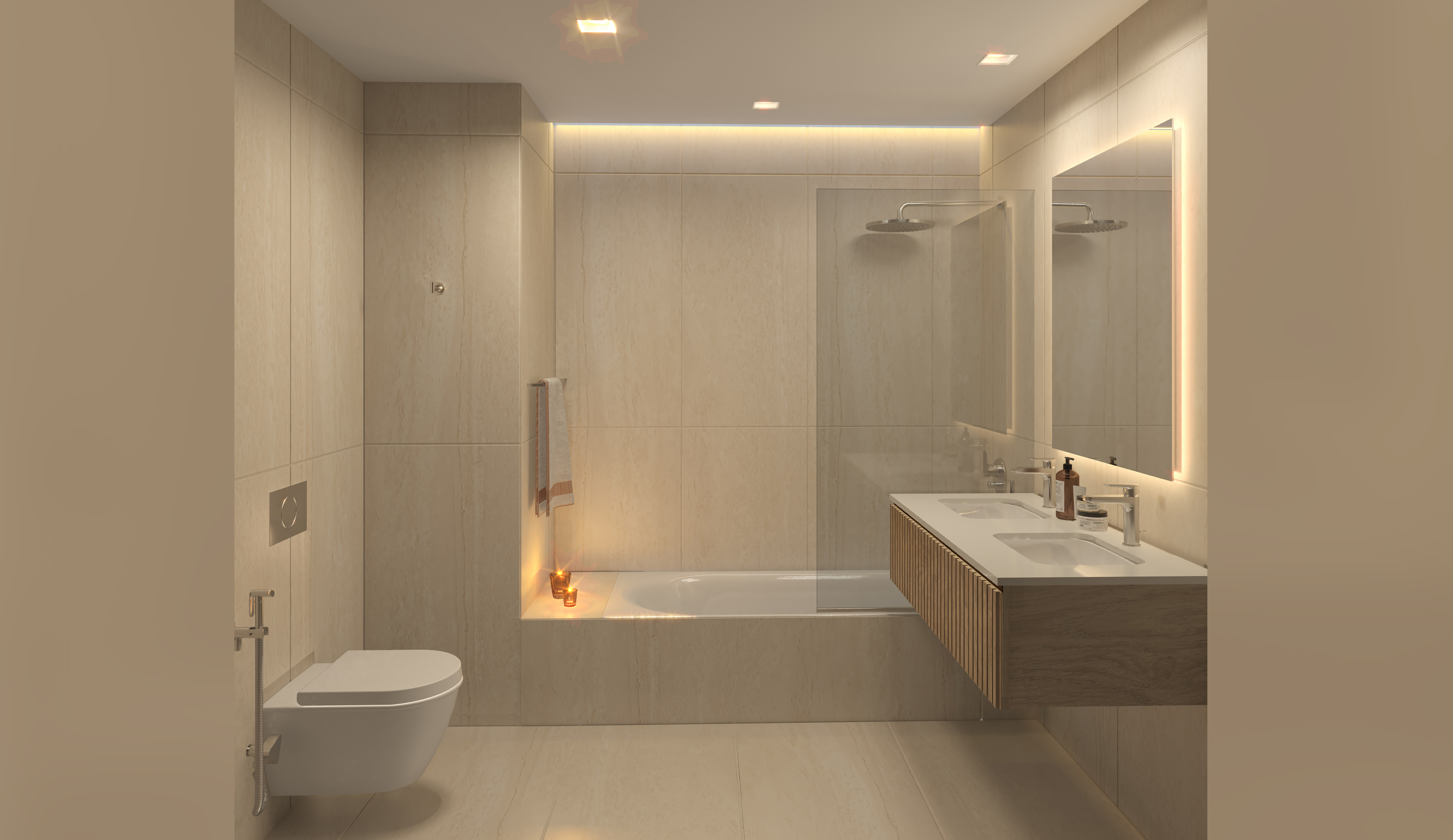 The interior design considers the relationship between design and privacy as a cultural value in contemporary architecture of Islamic societies. The apartment layout takes this principle into account, starting from the boundaries and openings of the apartment, moving through the entrance, and addressing the public and private areas of the house. The materials feature a neutral palette, using natural stone for floors and wall cladding in social areas, and creating a cozier ambiance in the rooms with wooden flooring. Wet rooms exhibit a combination of marble, decorative ceramic tiles, and wooden accents.